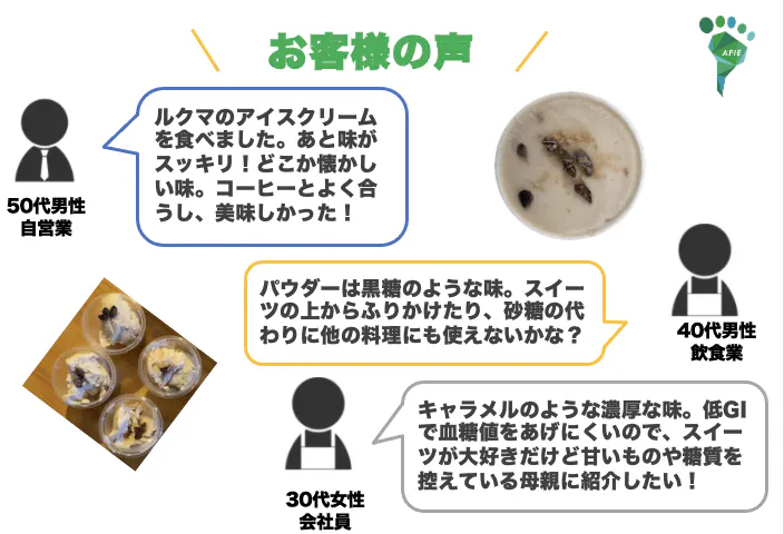 そう、私たちは自信をもってお勧めする商品をもっていますが、日本に馴染みがないがために、認知度が圧倒的に低いのです。そこで、このプロジェクトを通し、皆様にまずは「ルクマ」を知って頂く機会を作り、その見た目や効能、味などを「体感してもらう」ことができればと考えています。「ルクマ」の味を簡単に知ってもらえるよう、「アイスクリーム」の開発を行っており、「ルクマパウダー」と共にご支援のリターンとしています。