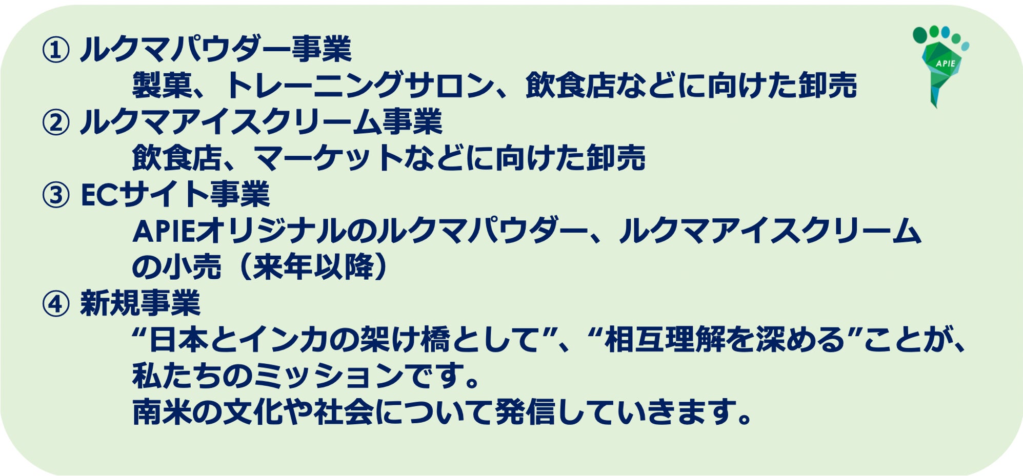 3月に立ち上げ以来、ペルー仕入元工場の開拓、国内でのアイスクリーム製造工場の契約、商品開発、販路開拓と準備を進めてきました。現在は、商品開発(現時点では、ルクマパウダーとアイスクリーム)と、ルクマパウダーを使った、完全オリジナルレシピの開発を実施中です!
