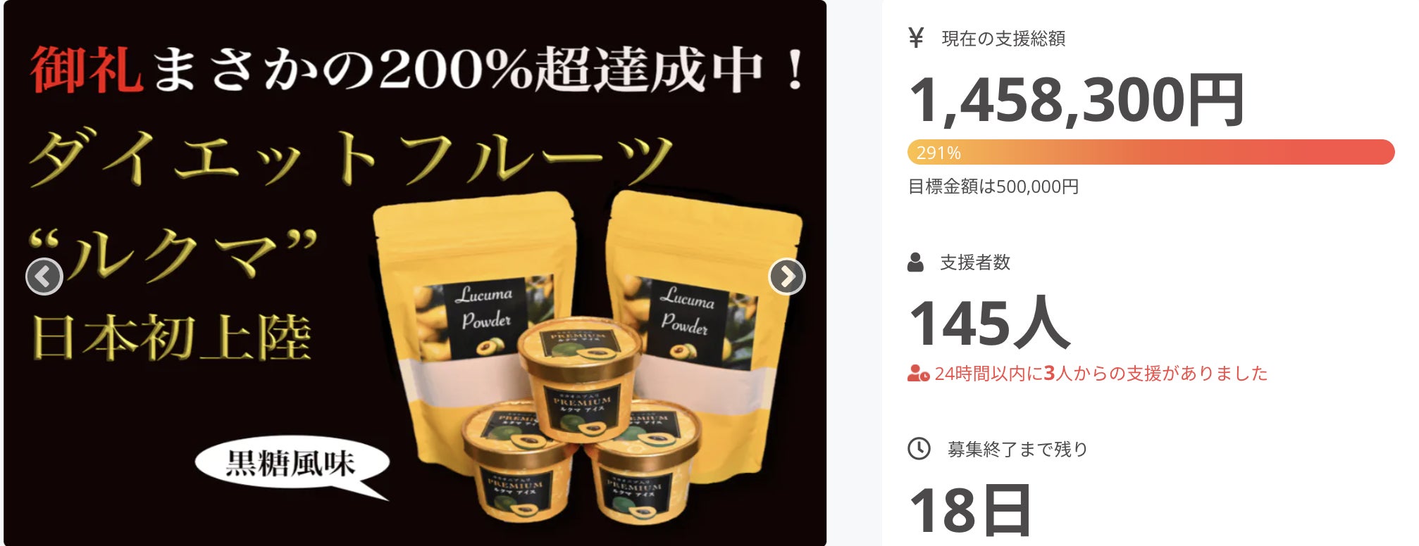 325%、167名のご支援。目標を大幅に達成!「美食の国、ペルーの定番!甘いダイエットフルーツ ”ルクマ” を日本の定番にしたい」プロジェクトオーナーのAPIE阪口&縄田屋です。この度はCAMPFIREでのご支援誠にありがとうございます!南米ペルーのルクマを日本の皆様へ届けたいと会社を立ち上げて約半年。商品化を行い、皆様からのご支援のもと、沢山の応援メッセージを頂き、このようにプロジェクトを成功させることができ、感謝の気持ちでいっぱいです。個別にメールをお送りいたしました! 2021/8/31(火)にプロジェクトが終了し、昨日、ようやくご支援者の皆様の情報が手元に届きましたので、ご登録先のメールアドレスに、メッセージをお送りいたしました。その中で、配送などに関して、いくつかお聞きしたい点がございますので、ご確認をいただけますようお願い申し上げます。プロジェクト概要期間: 2021/7/22(木)0:00 〜 2021/8/31(火) 23:59支援者数: 167名支援金: 1,629,140円達成率: 325%リターン品について9/10(金)〜9/13(月)にお届けできるよう、最終の準備を進めております。個別にお送りしていますアンケートより、配送日時の入力のご協力お願い申し上げます。