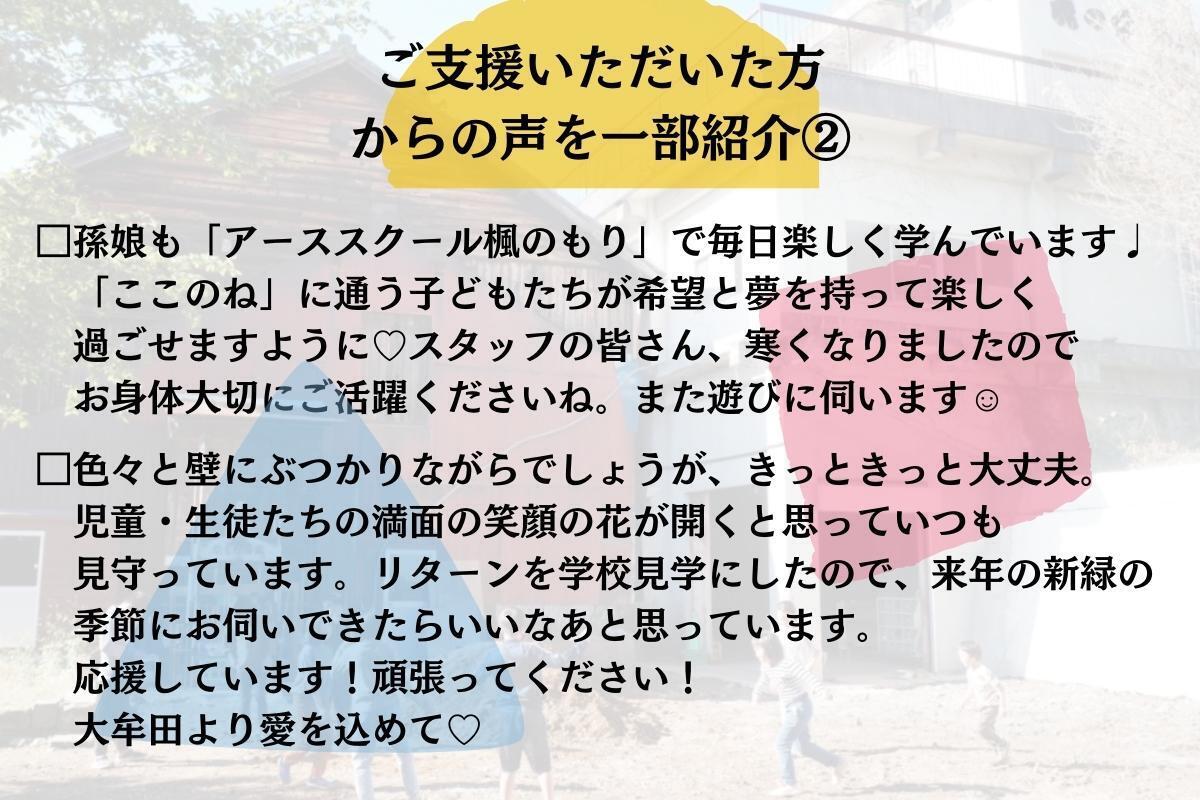 スタッフ一同、ここのね保護者一同、とても感動しております。皆さま一人一人の想いが私たちに伝わってきております。見ず知らずの私たちの活動にお志を寄せていただき、心から感謝しております。