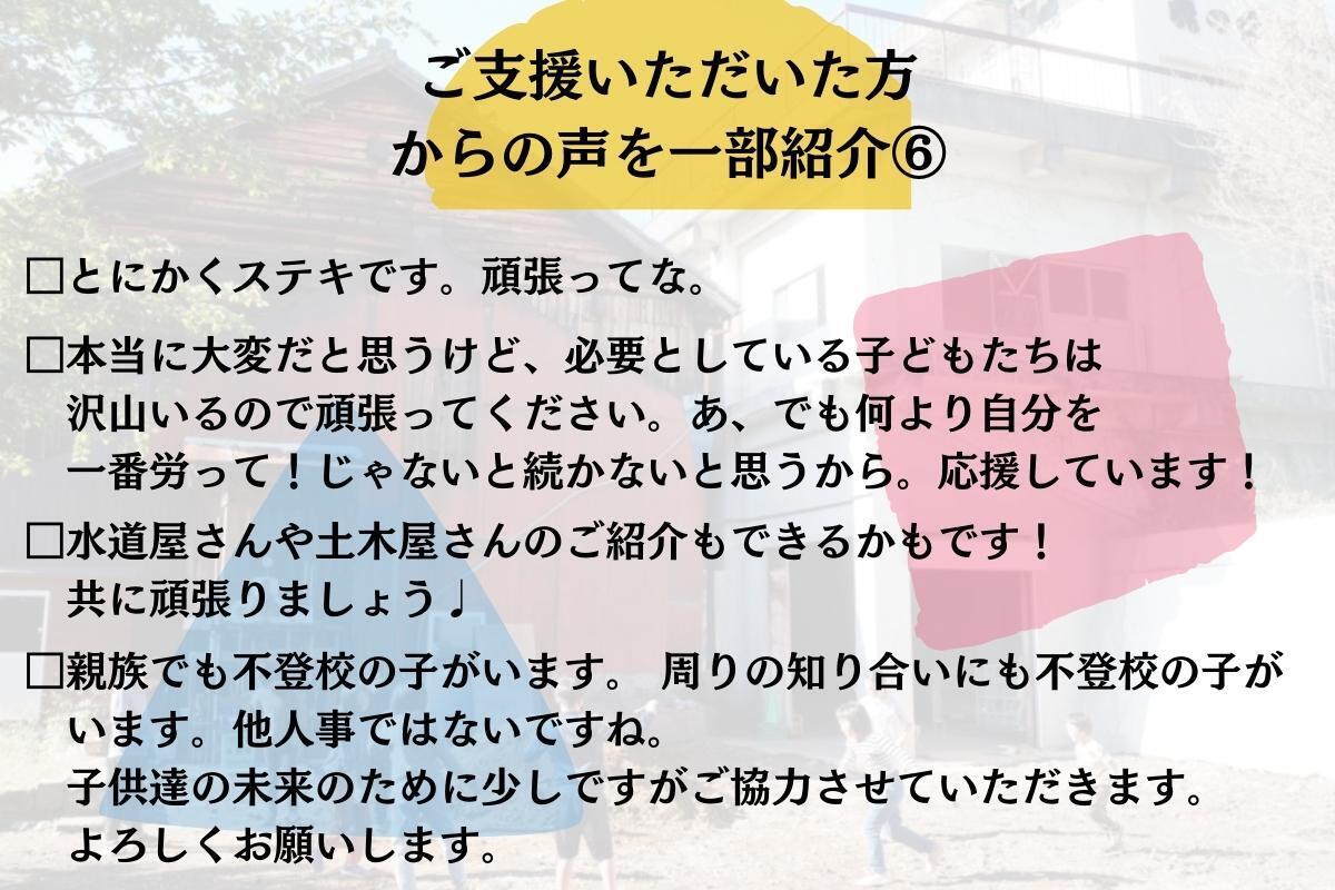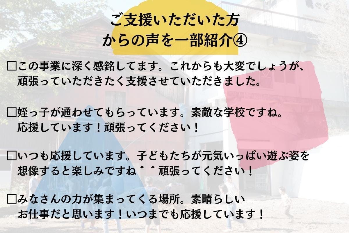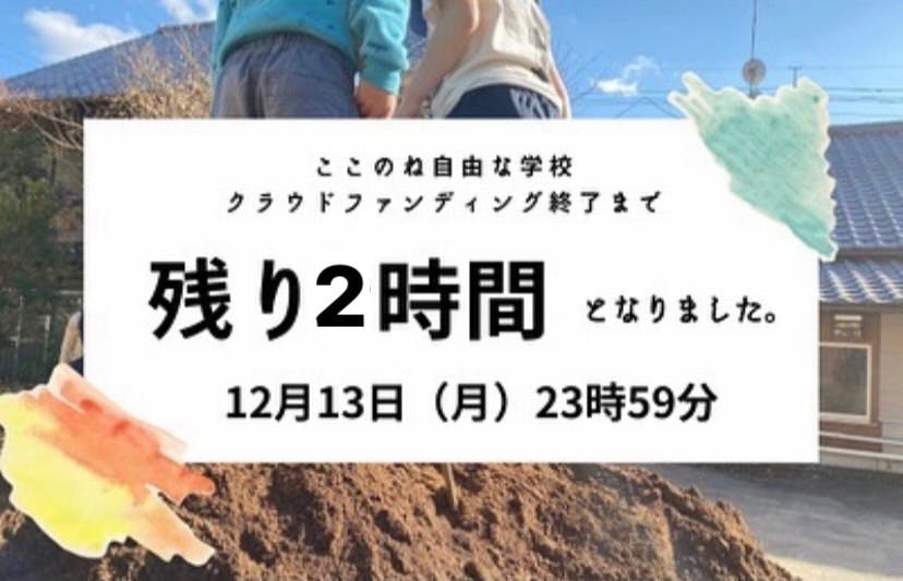 2021/12/13 21:56自分を見つめ直した時間。夢のような時間。背中を押し続けてもらった時間。それが、あと3時間で終わります。僕が小学生の時、部屋でひとり壊れてしまったように、涙が止まらなくて立ち上がれなくなってしまったように、人なんて環境によっては簡単に壊れてしまうんです。でもそんな時に、「こんな場所があるよ。行ってみない?」両親が伝えてくれたこの言葉によって、僕は救われました。だから中学生の時からずっと考えてました「こんな学校あったらいいな」って。その夢は、いま仲間と共に叶いはじめています。何が正解かなんて何もわかりません。だから進むしかありませんでした。高い壁に何度も何度もぶつかりながら「もう無理かも…」って諦めそうになったことも1回ではありません。今回もそうです。☆子どもたちに綺麗な校庭で走り回ってほしい☆トイレに行きずらいと我慢しないでほしいでもどうしても自分達の手だけでは太刀打ちできませんでした。プロの手を借りないとできませんでした。だからクラウドファンディングに挑戦しようと決めました。しかし簡単ではなかったです。すごく辛くて苦しい時もありました。「いまやらなくてもいいんじゃない?」「もっとゆっくりしようよ!」「働きすぎだって!」目の前の子どもの姿や保護者さんとのコミュニケーション不足に陥ってしまい、「なんでそんなことに気づけなかったんだ」と、鉄橋の上で号泣した夜もありました。もっとうまくできたかもしれないし、計画的にやればみんながスムーズにできたかもしれない。でも目の前には、心が折れてしまった小さい頃の僕のように「新しいカタチ」を求めている子どもたちがいる、保護者の人がいる。だから公開に踏み切りました。無理を承知で仲間と保護者の方に助けてもらいました。そしたら、みなさんから背中を押してもらえました。こんなにも支援が集まるなんて夢のようです。本当に、本当に、ありがとうございました。奇跡が起こり続けた1ヶ月でした。一緒に走ってくれてすごく嬉しかったです。そして今日は奇跡の終わりの日。ここのねが目指すゴールはもう目の前に届きそうなところにあります。応援してくださる皆様へ最後のお願いです。本プロジェクトに共感いただける方は、シェア・寄付等でのこ支援をなにとぞよろしくお願いいたします!!! もっと見る