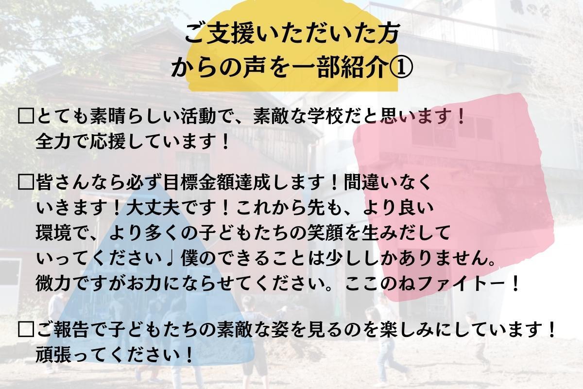2021/12/13 21:56自分を見つめ直した時間。夢のような時間。背中を押し続けてもらった時間。それが、あと3時間で終わります。僕が小学生の時、部屋でひとり壊れてしまったように、涙が止まらなくて立ち上がれなくなってしまったように、人なんて環境によっては簡単に壊れてしまうんです。でもそんな時に、「こんな場所があるよ。行ってみない?」両親が伝えてくれたこの言葉によって、僕は救われました。だから中学生の時からずっと考えてました「こんな学校あったらいいな」って。その夢は、いま仲間と共に叶いはじめています。何が正解かなんて何もわかりません。だから進むしかありませんでした。高い壁に何度も何度もぶつかりながら「もう無理かも…」って諦めそうになったことも1回ではありません。今回もそうです。☆子どもたちに綺麗な校庭で走り回ってほしい☆トイレに行きずらいと我慢しないでほしいでもどうしても自分達の手だけでは太刀打ちできませんでした。プロの手を借りないとできませんでした。だからクラウドファンディングに挑戦しようと決めました。しかし簡単ではなかったです。すごく辛くて苦しい時もありました。「いまやらなくてもいいんじゃない?」「もっとゆっくりしようよ!」「働きすぎだって!」目の前の子どもの姿や保護者さんとのコミュニケーション不足に陥ってしまい、「なんでそんなことに気づけなかったんだ」と、鉄橋の上で号泣した夜もありました。もっとうまくできたかもしれないし、計画的にやればみんながスムーズにできたかもしれない。でも目の前には、心が折れてしまった小さい頃の僕のように「新しいカタチ」を求めている子どもたちがいる、保護者の人がいる。だから公開に踏み切りました。無理を承知で仲間と保護者の方に助けてもらいました。そしたら、みなさんから背中を押してもらえました。こんなにも支援が集まるなんて夢のようです。本当に、本当に、ありがとうございました。奇跡が起こり続けた1ヶ月でした。一緒に走ってくれてすごく嬉しかったです。そして今日は奇跡の終わりの日。ここのねが目指すゴールはもう目の前に届きそうなところにあります。応援してくださる皆様へ最後のお願いです。本プロジェクトに共感いただける方は、シェア・寄付等でのこ支援をなにとぞよろしくお願いいたします!!! もっと見る