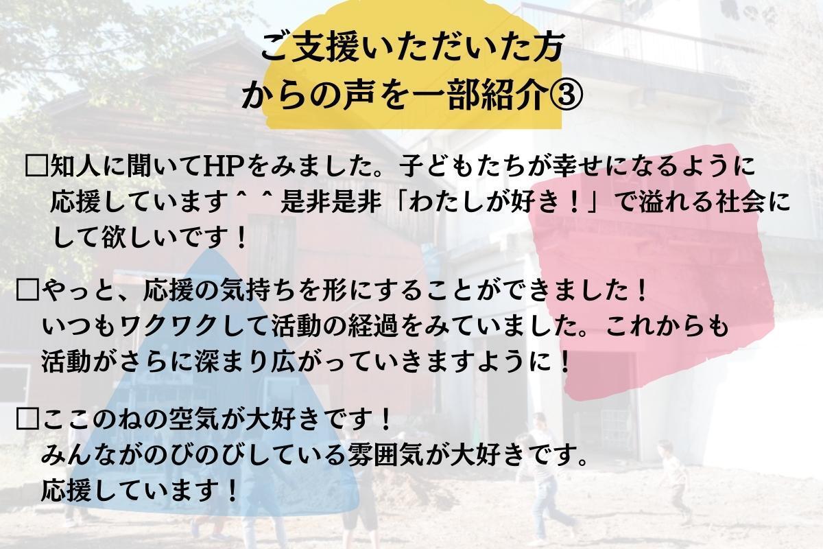 この度は、心からのご支援をいただき、本当に本当にありがとうございました。最終日になるときまで、ここのねの未来のために私たちは走り続けます。
