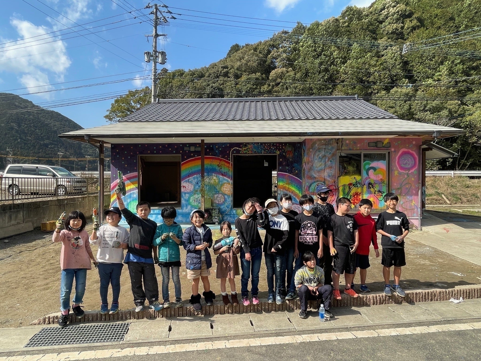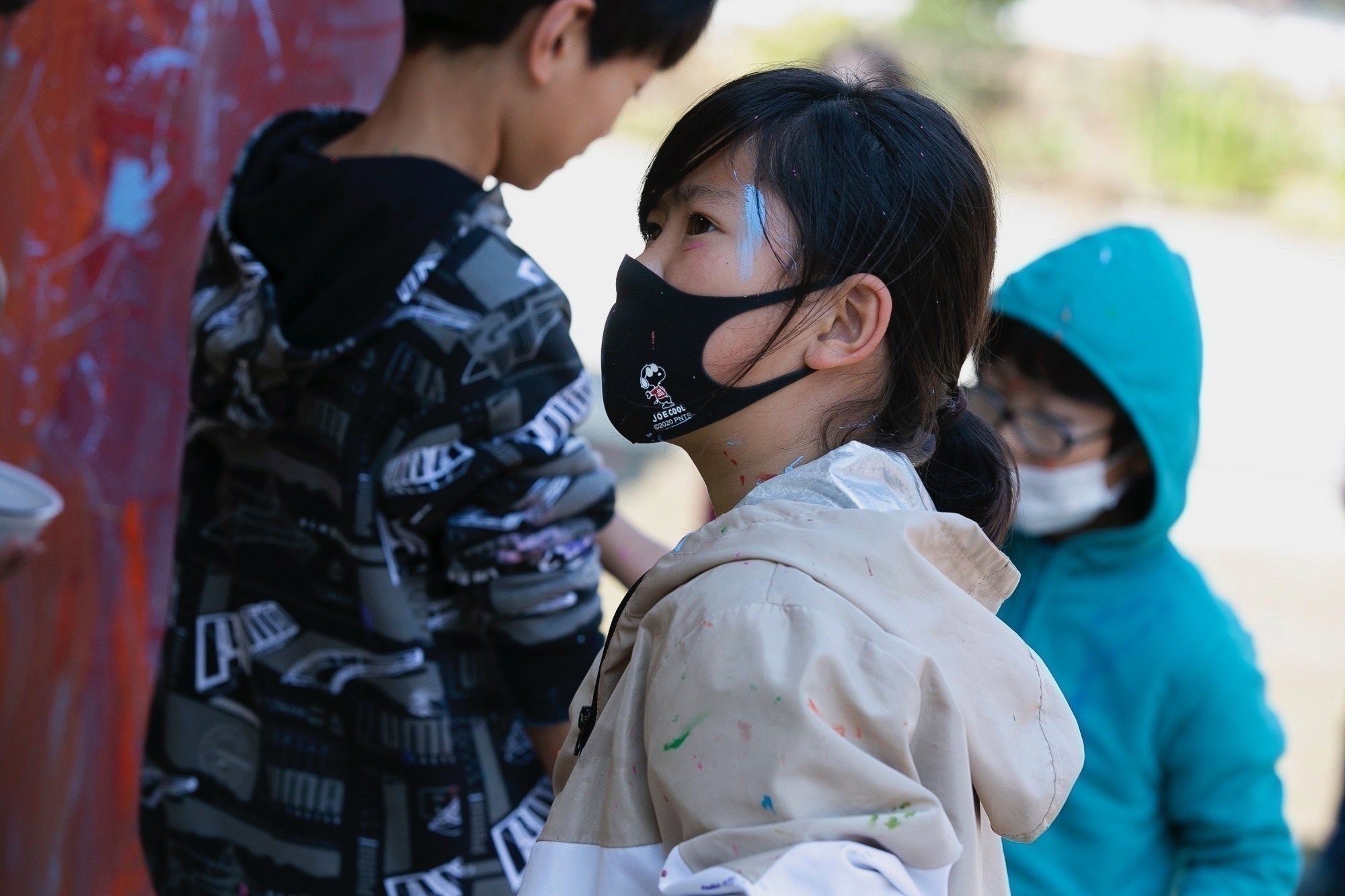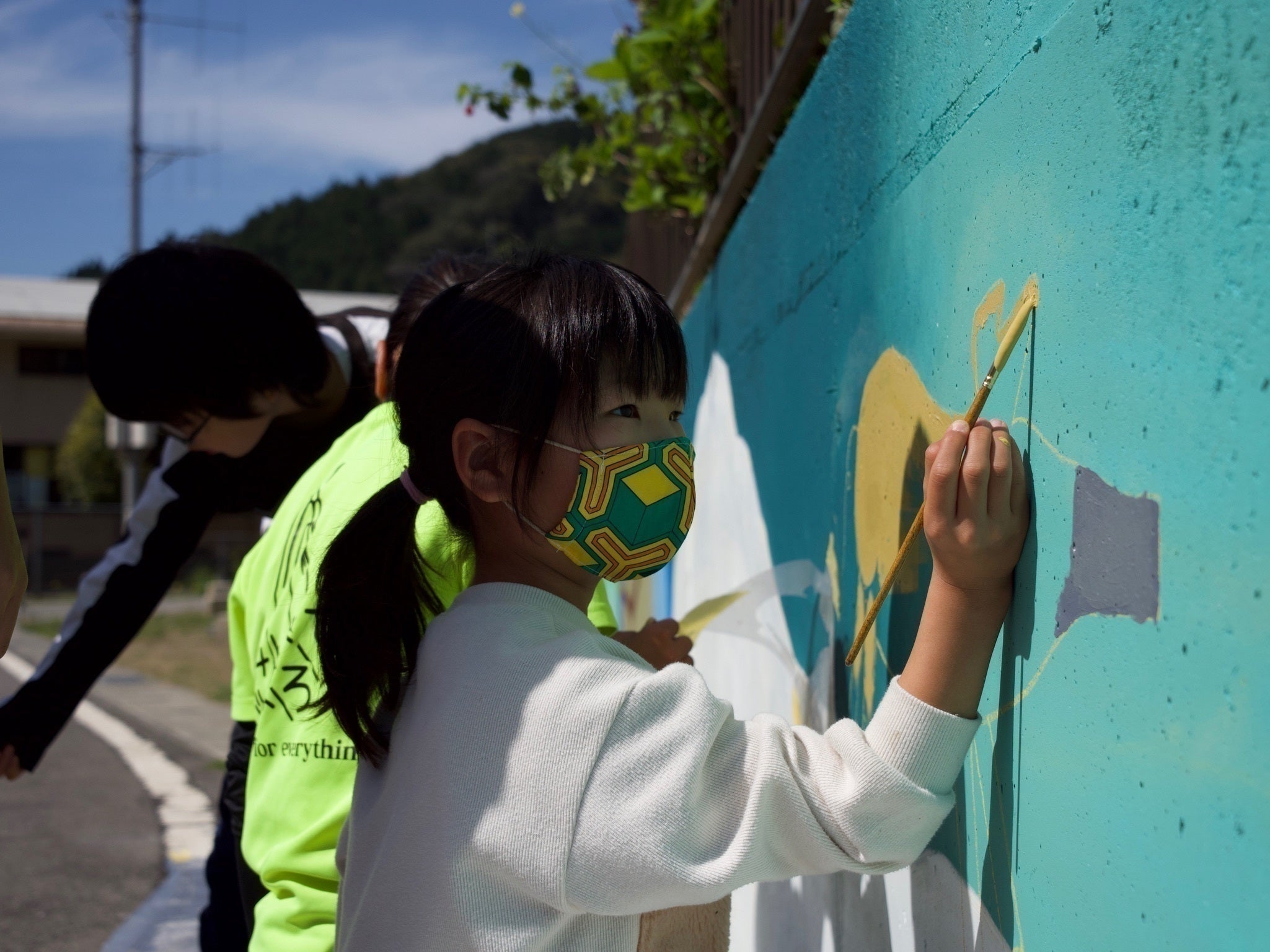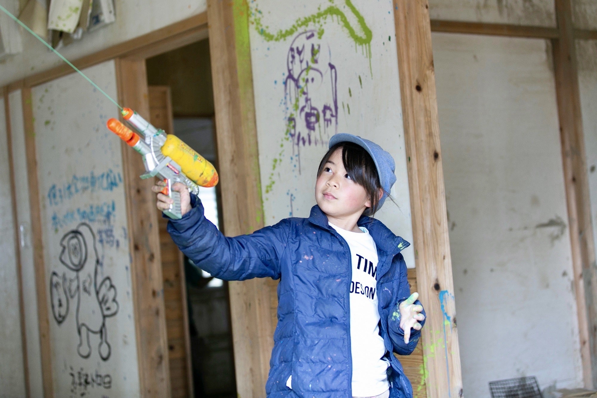 前回は解体の決まった村営住宅3棟の壁と、被災した家の擁壁部分にアーティストと子供たちで絵を描きました。村営住宅はそれぞ別々のアーティストが担当し、それぞれ趣向を凝らしました。例えば、ゲーム『スプラトゥーン』のように水鉄砲の中にペンキを入れ住宅の壁にペンキを打ったり、子供たちの手形を木々の花びらや葉っぱに例えて球磨村の四季を表現したり・・・子供たちは自らが汚れることも気にせずに笑顔で作品を作っていました。
