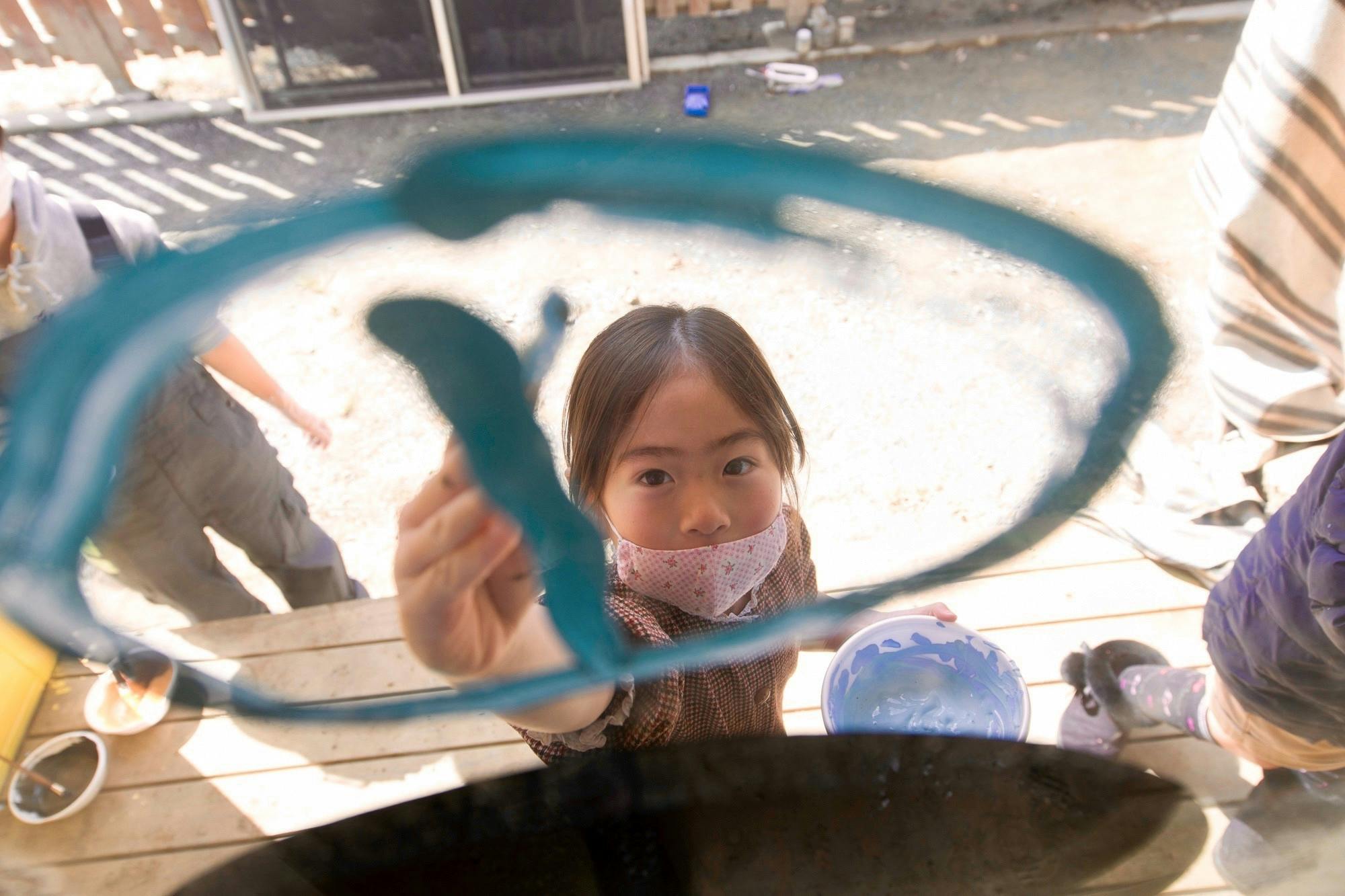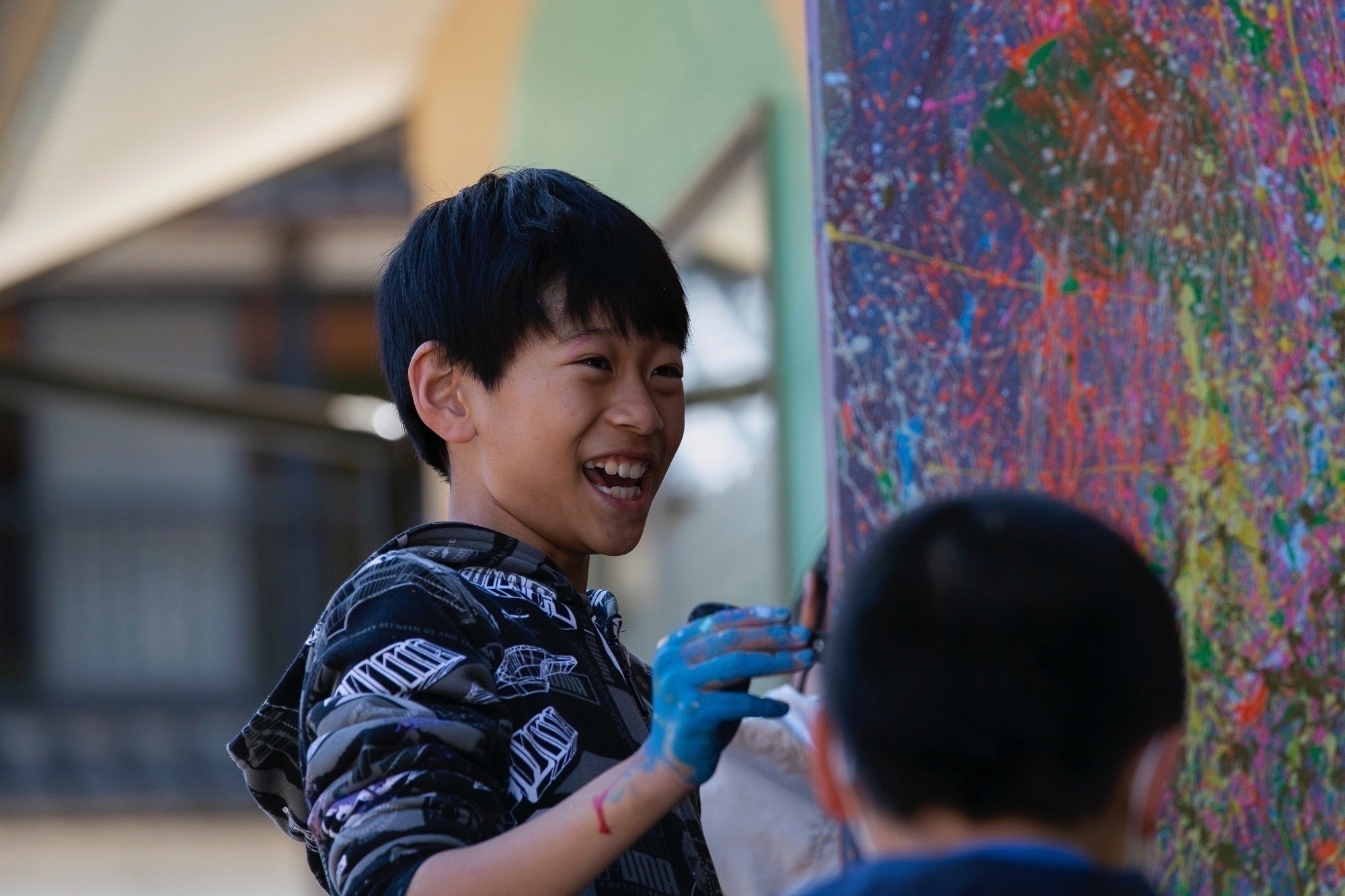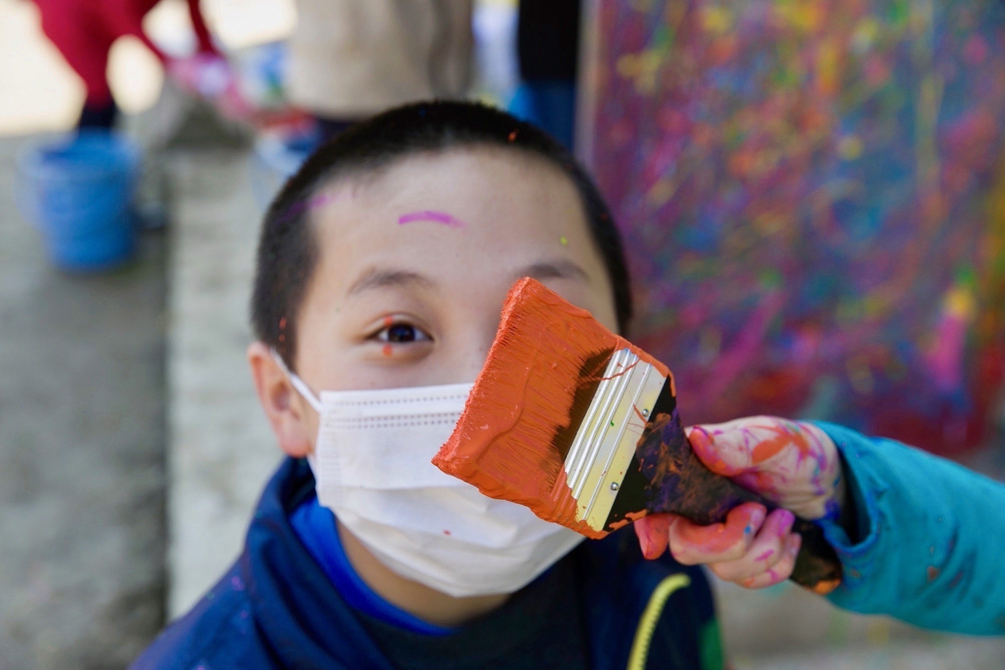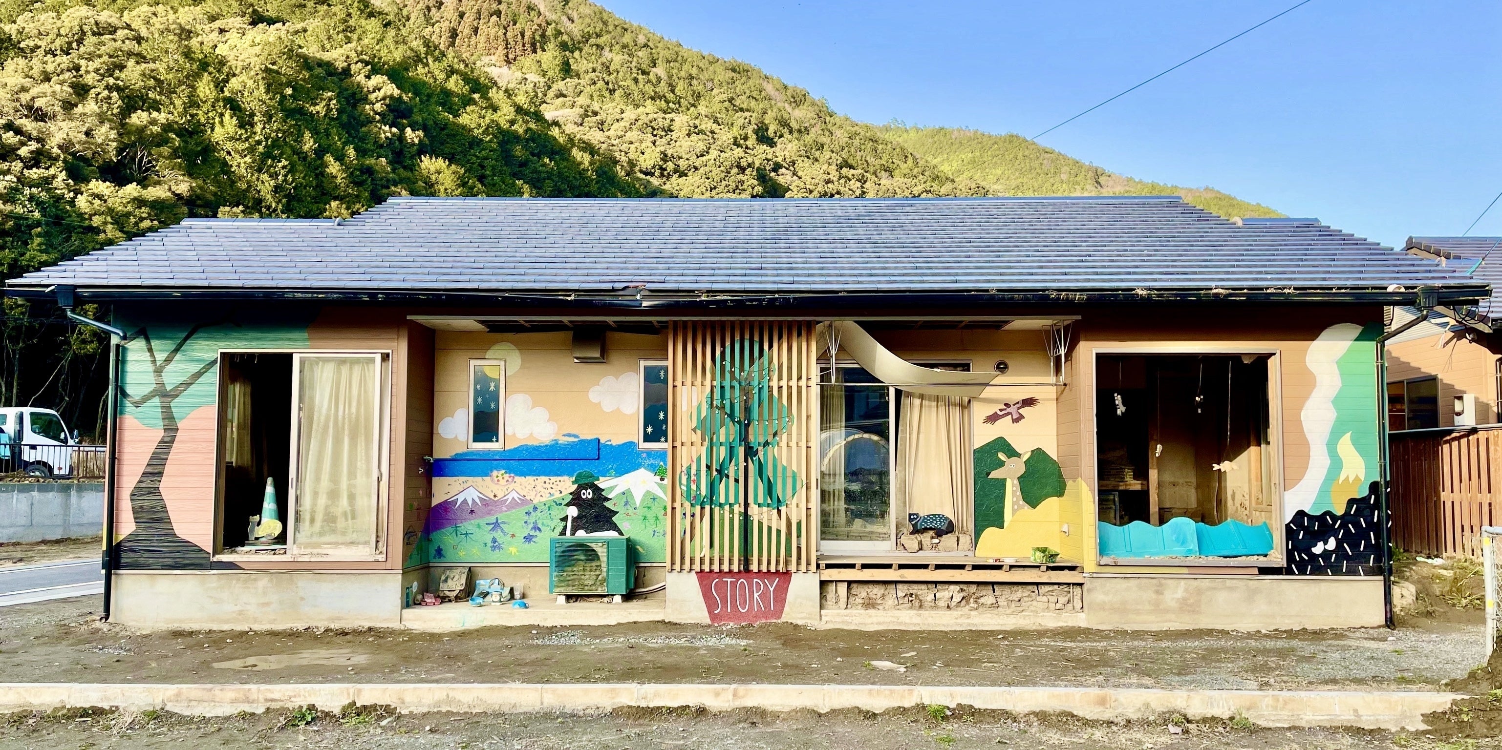 前回は解体の決まった村営住宅3棟の壁と、被災した家の擁壁部分にアーティストと子供たちで絵を描きました。村営住宅はそれぞ別々のアーティストが担当し、それぞれ趣向を凝らしました。例えば、ゲーム『スプラトゥーン』のように水鉄砲の中にペンキを入れ住宅の壁にペンキを打ったり、子供たちの手形を木々の花びらや葉っぱに例えて球磨村の四季を表現したり・・・子供たちは自らが汚れることも気にせずに笑顔で作品を作っていました。