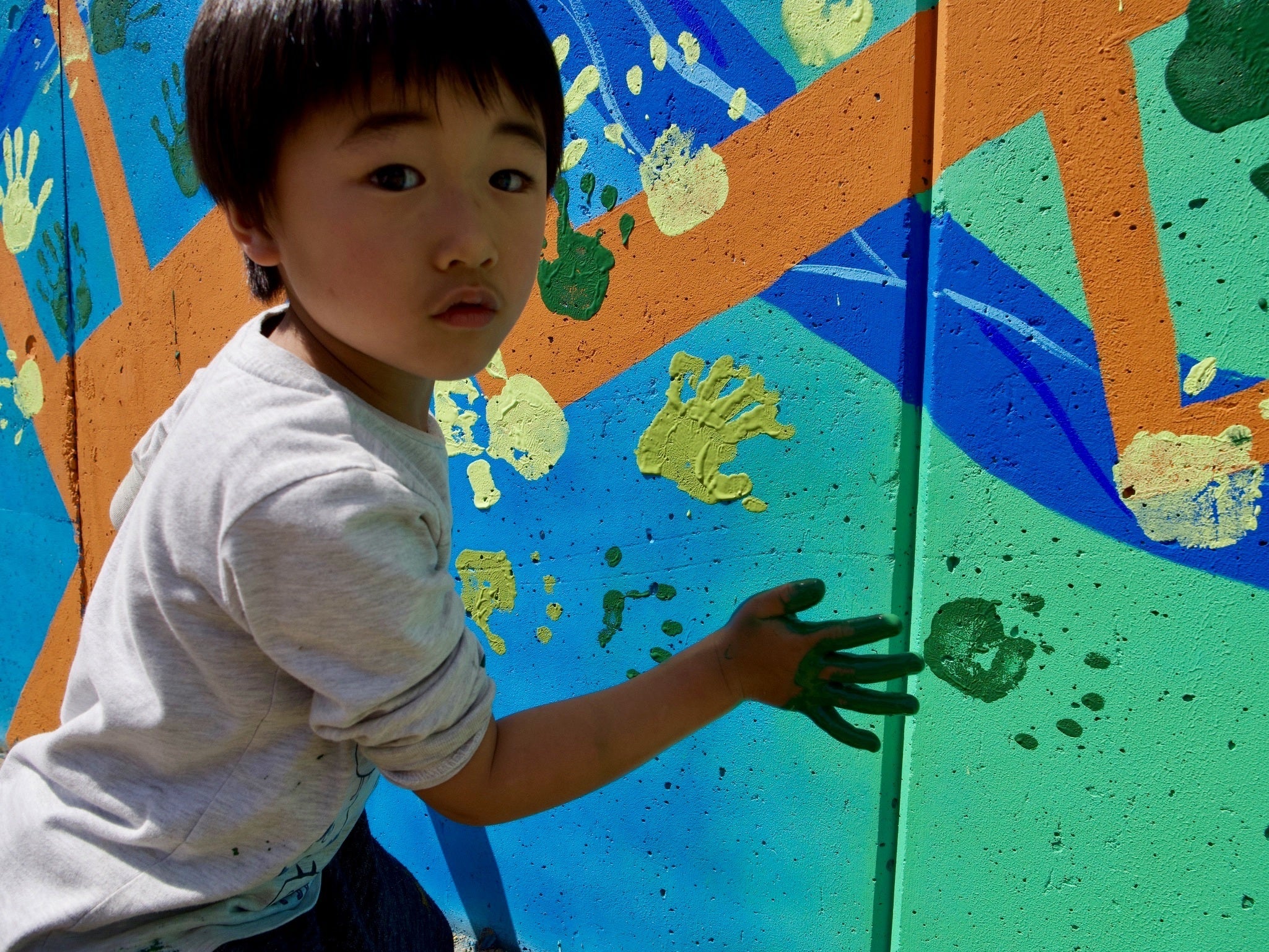 そこで私たちは地域コミュニティの再生と子供たちの心のケアを目的として、被災というマイナスのイメージと対極にある芸術を活用し解体の決定している村営住宅の壁や被災した土地の擁壁を利用して、アーティスト監修のもと子供たちと絵を描き遊び尽くしました。