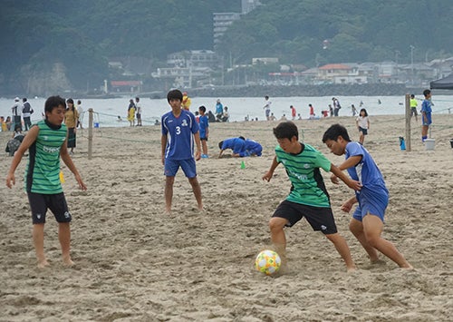 ビーチサッカーは、簡単に言うと、砂浜で行うサッカーです。もともとブラジルで始まりました。11人制のサッカーとは、ルールが違う部分もありますが、有名なサッカー選手がビーチサッカーに転向することもしばしばあって、ビーチサッカー普及の原動力にもなっています。何と言っても、砂の上を駆け回りますから、すごく体力を使います。そして、オーバーヘッドキックやダイレクトボレーなど様々なアクロバチックな技も繰り出され、やるのも見るのも非常に面白いスポーツとなっています。それでいて、初心者や女性でも、レベルに合わせて十分に楽しむことができます。ユニークな点としては、試合中も音楽を流し続け、さらにMCが試合を盛り上げます。開放的な夏のビーチにぴったりの楽しいスポーツです。