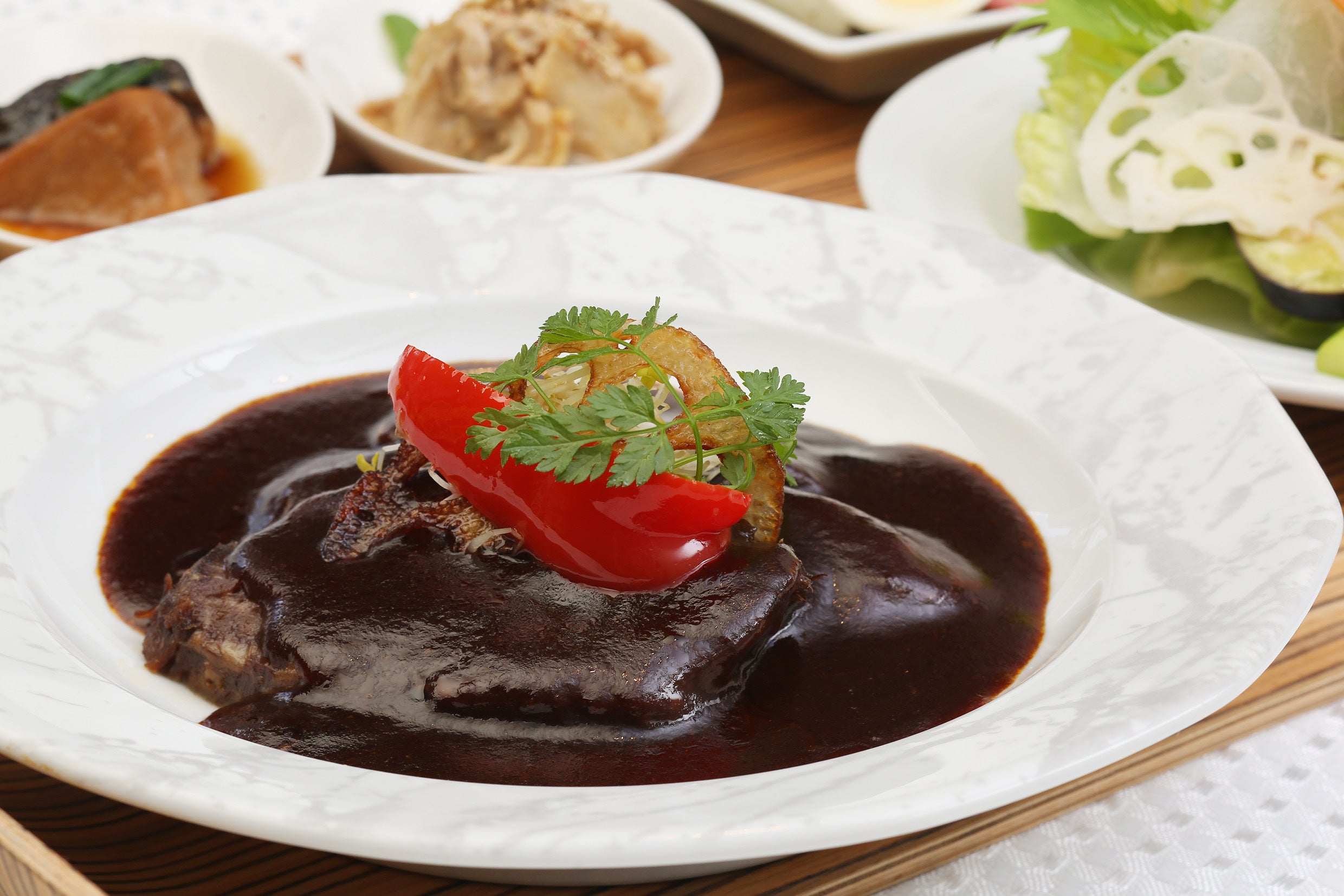 初めての方は、ゴロッと2つ入った牛タンの大きさにきっと驚かれます。 赤ワインをドゥミグラスソースで極限まで煮込んだ牛タンは、口の中でほろほろほどける柔らかさ。 自家製のドゥミグラスソースは、肉や野菜、中でも淡路産の甘いタマネギをふんだんに使い、 1週間かけてじっくり煮込んで仕上げています。 そのままでもOKですが、ご飯にかけるとハヤシライスとしてお楽しみいただけます。