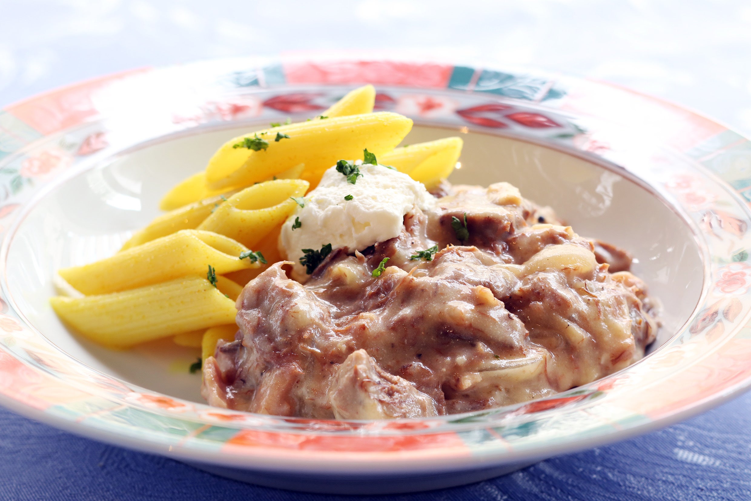 サワークリームを贅沢に使って、とろけるようになるまで煮込んだ柔らかい牛タンと 優しいホワイトソースの味わいが広がるストロガノフ。 ご飯にもパンにもパスタにも、そしてもちろんお酒のお供にも! 優しい味わいはお子様にも美味しくお召し上がりいただけます。