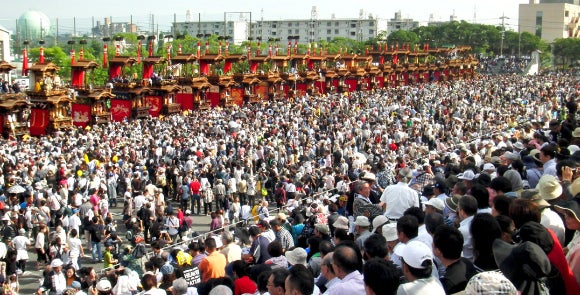 市内10地区、それぞれが自慢の山車を曳き回す。