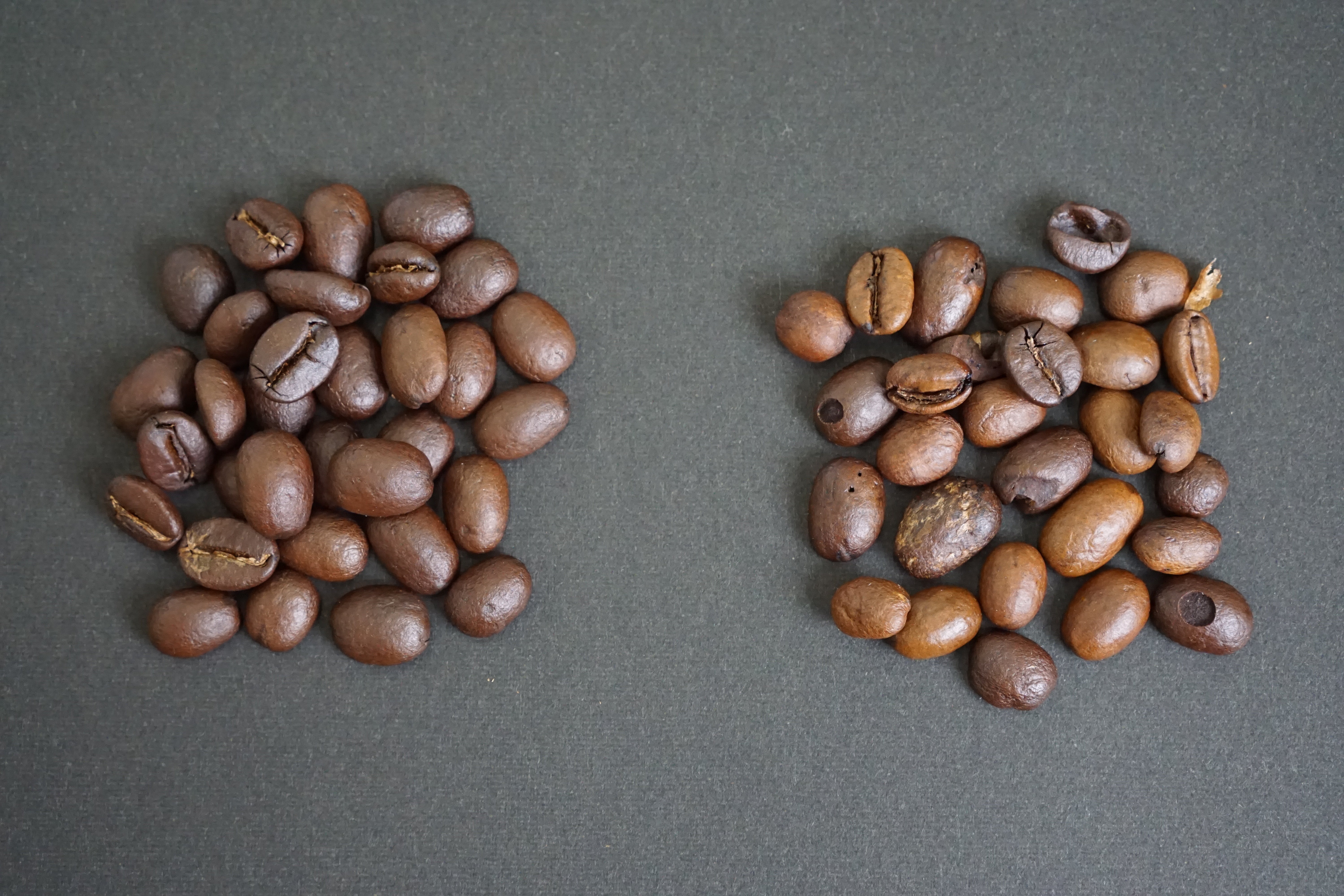 良品(左側)と不良豆(右側)。味わいを損ねる可能性のある豆をひと粒ひと粒取り除きます。