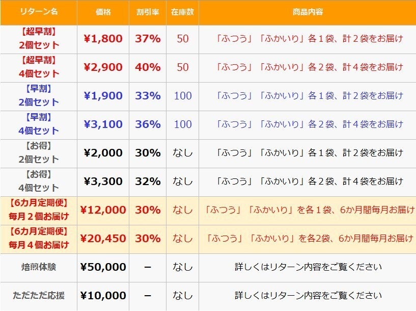 今回焙煎工場始動を記念し、ネットショップ開業に先立って、CAMPFIRE会員さま限定の超リーズナブルなセット商品をご用意しました。
