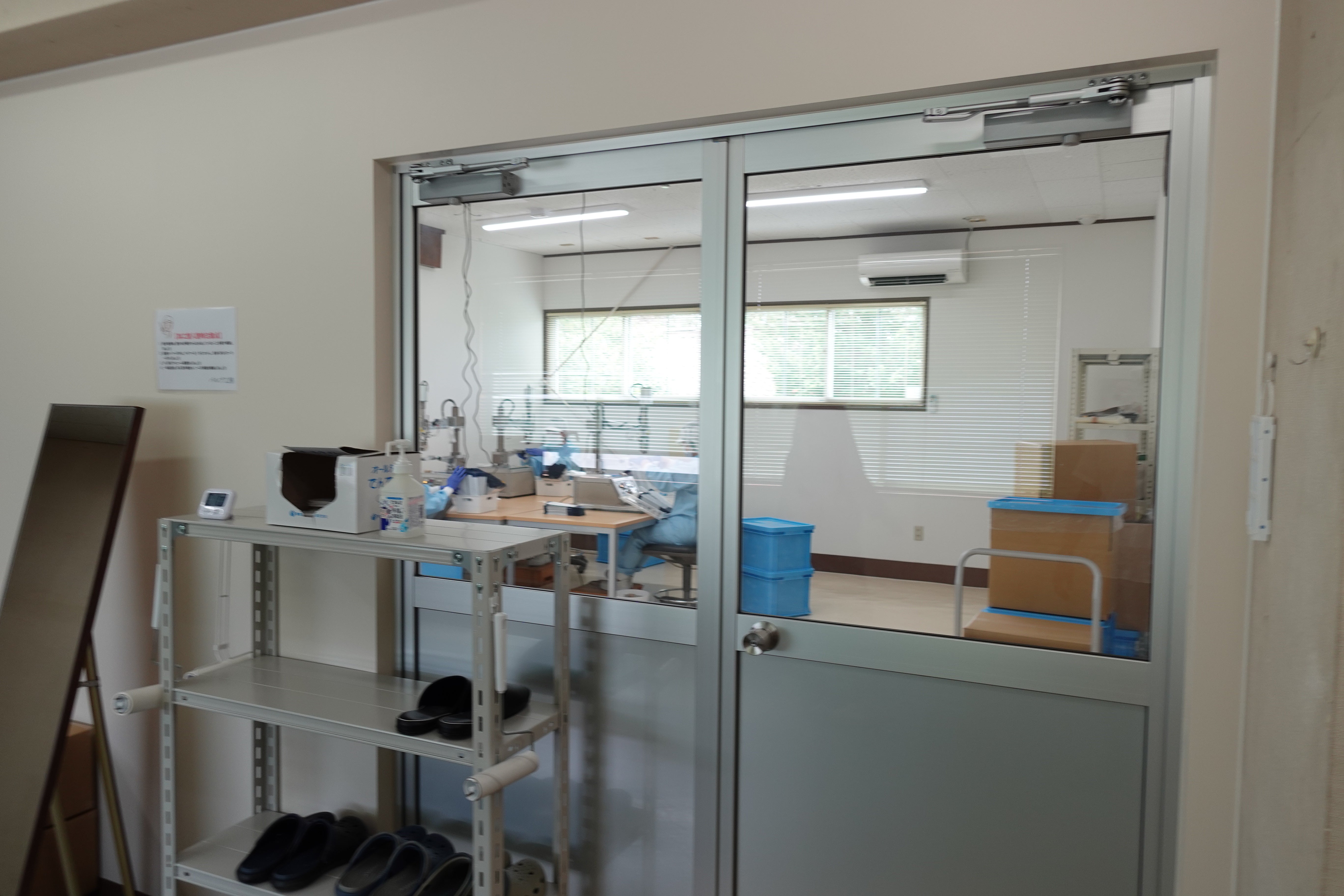 見学者の私も消毒をしてヘアキャップをして、1分間、体中コロコロでホコリを取ってから入室。