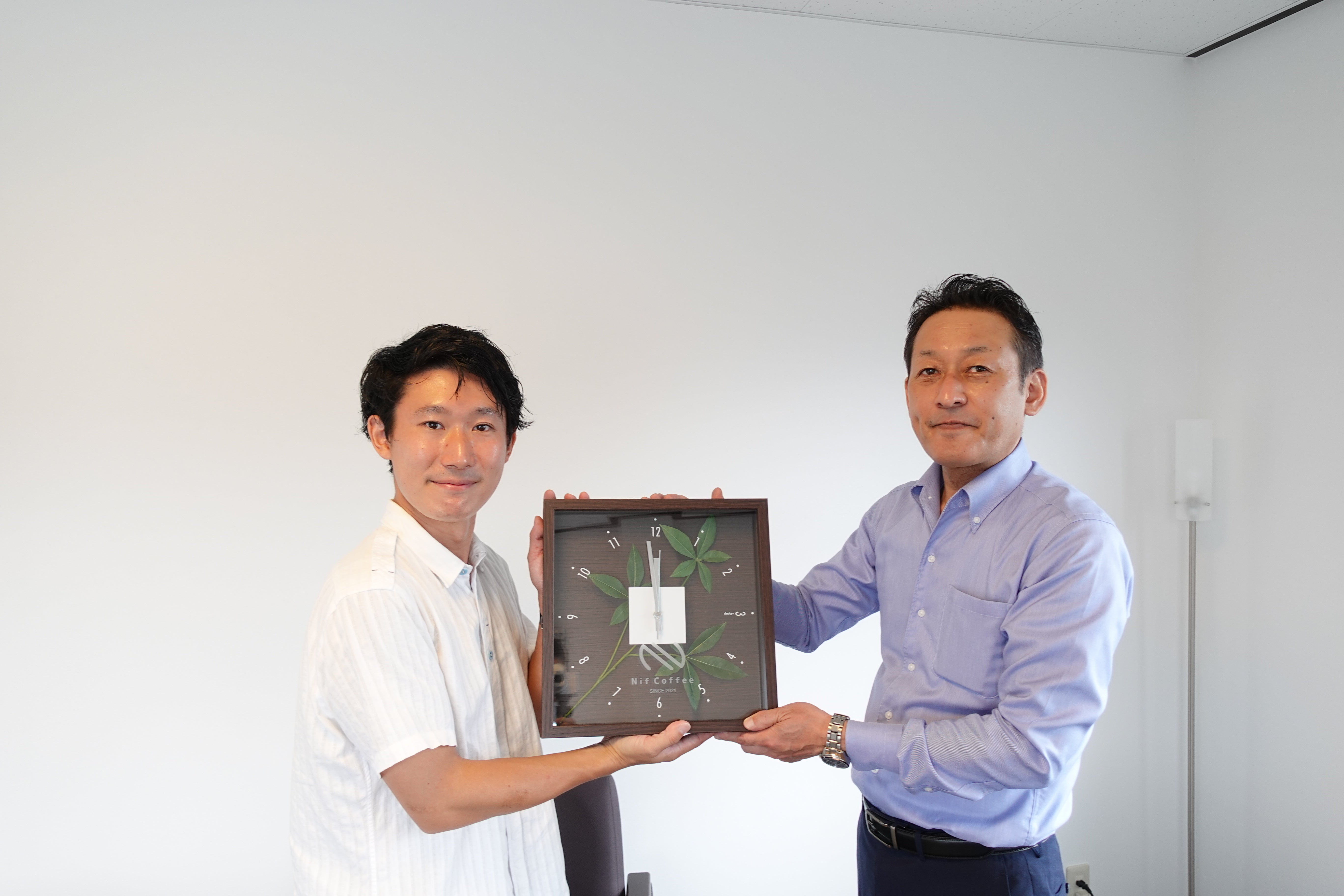 サプライズで開業記念としてNif Coffeeのロゴ入り時計をいただきました。黒堂社長と記念撮影。