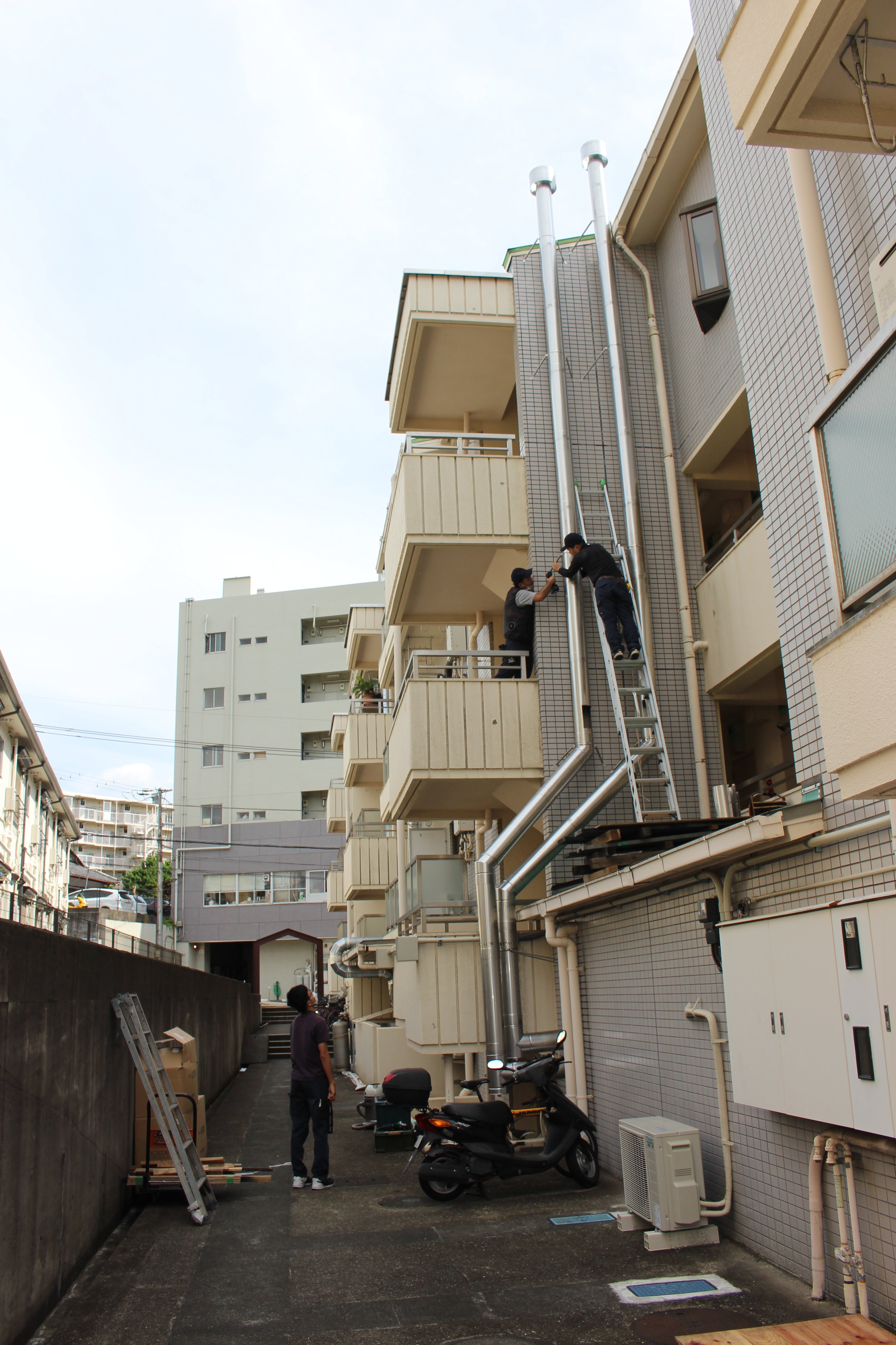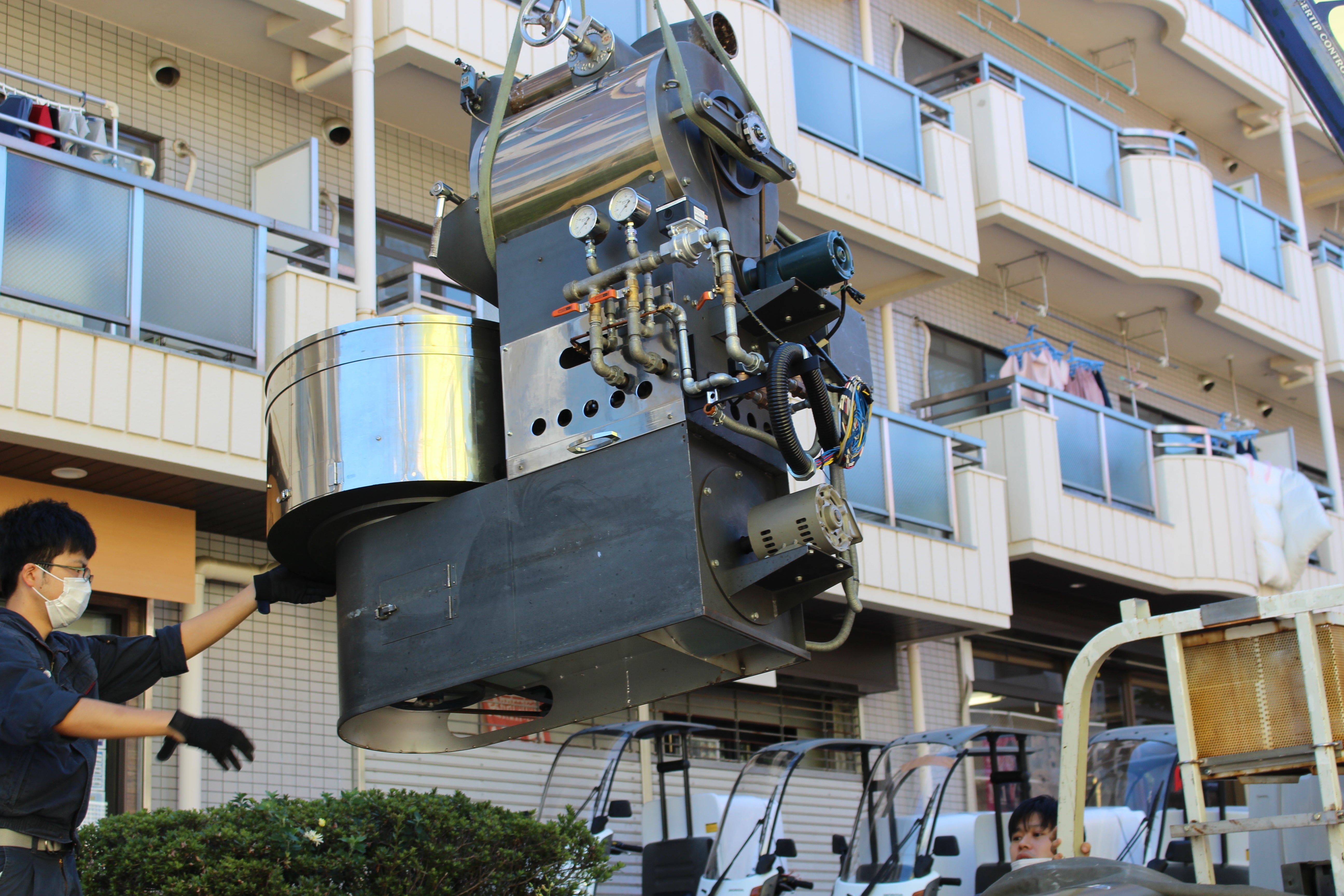 焙煎機が宙に浮いたり、15m以上の高さをハシゴでのぼる忍者のような作業員さんの雄姿。