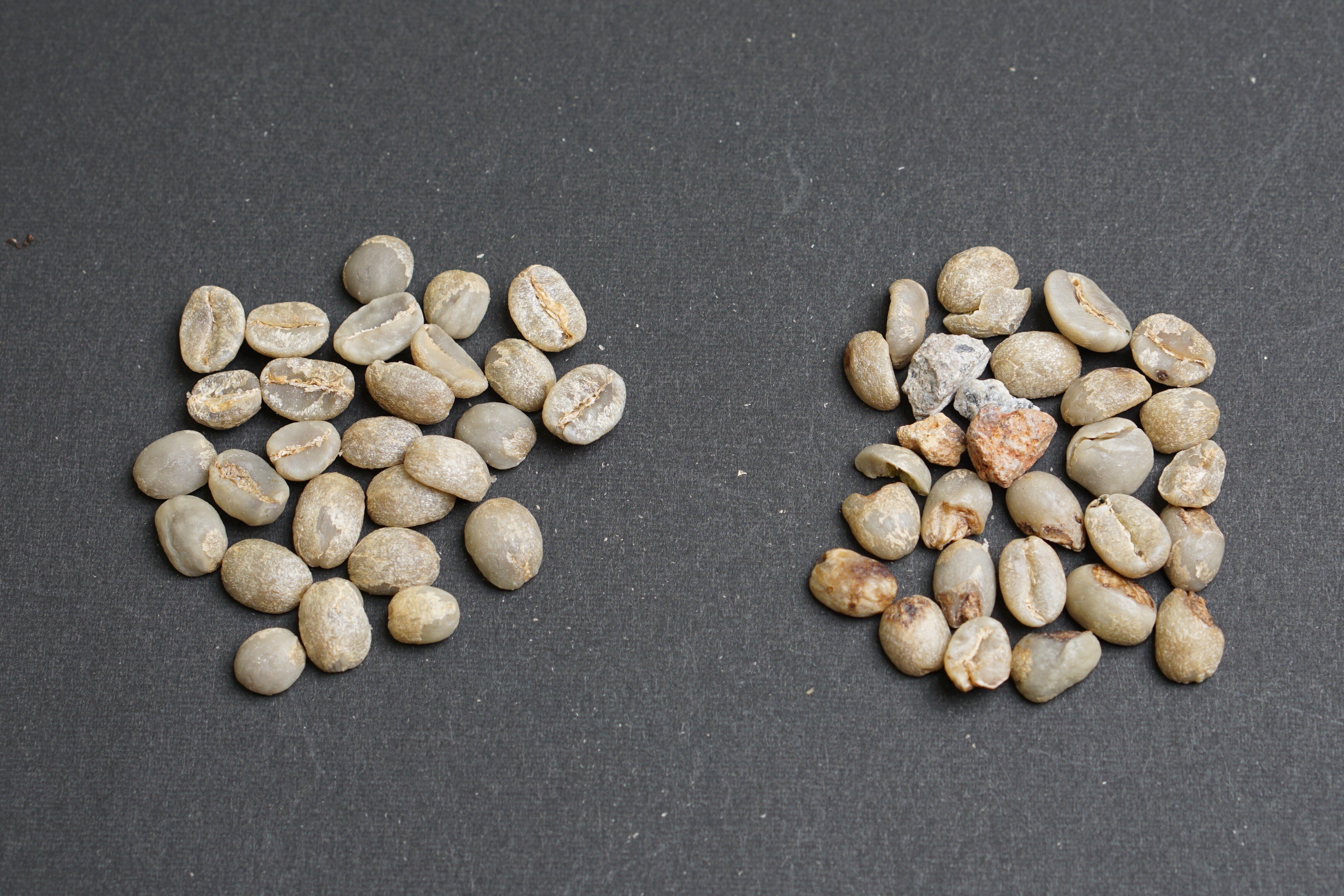 良品(左側)と、手作業で取り除いた欠け豆や虫食い豆や小石など(右側)。