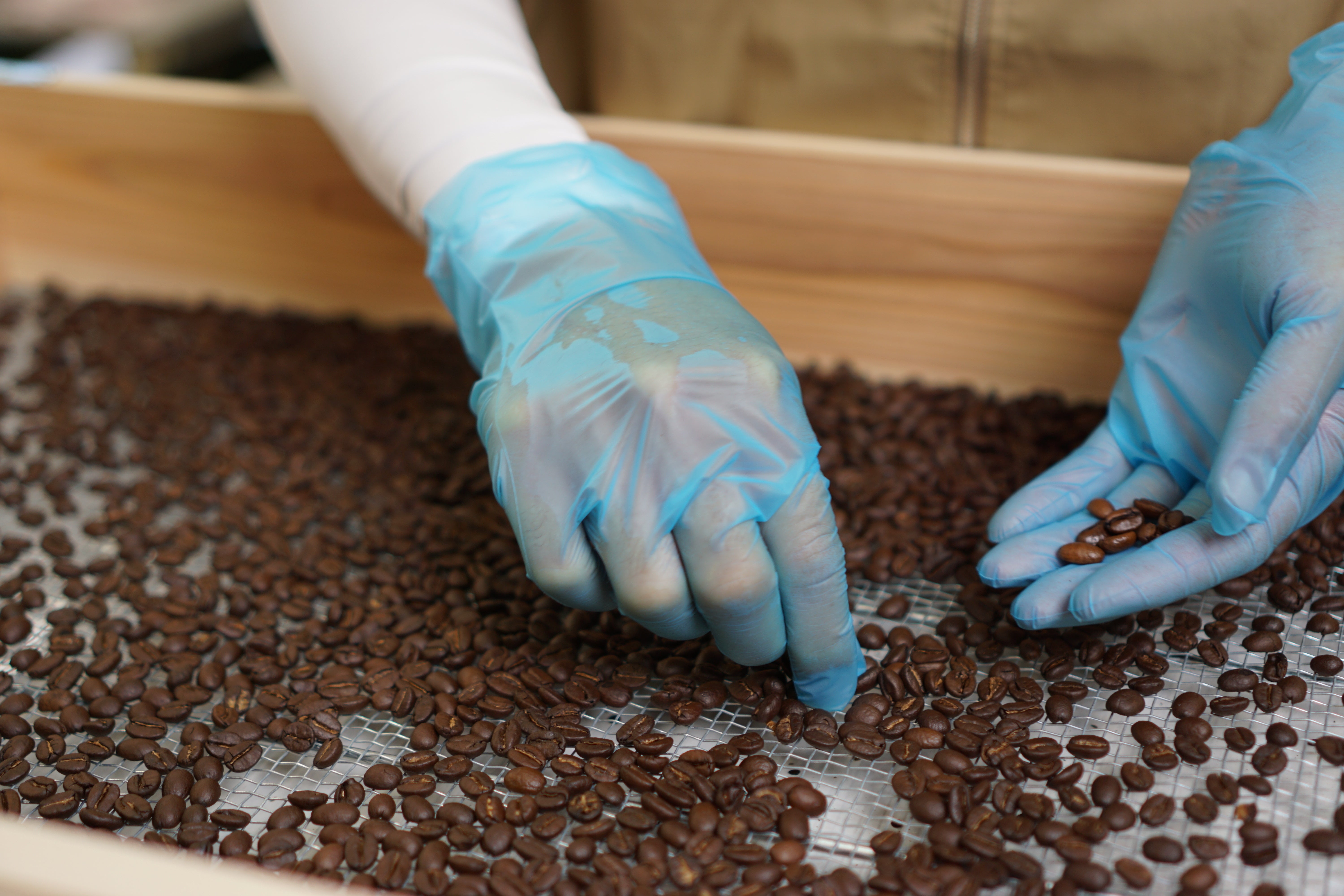 ・焙煎前に生豆の手選別を行い、異物や不良豆の除去