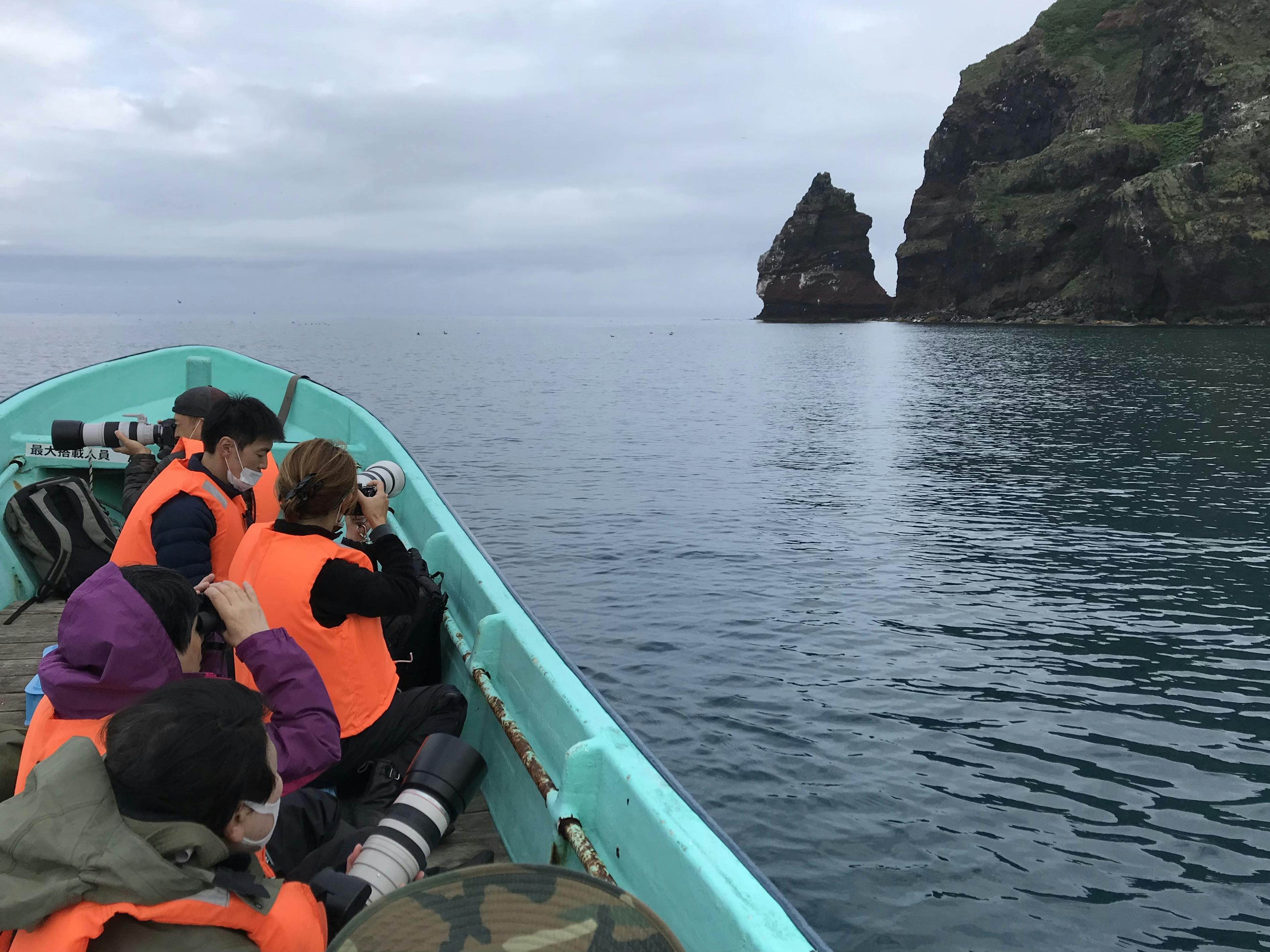 写真は、乗客定員6名の小型ボート「ケイマフリ号」に参加者6名が乗船している様子です。船長は自然写真家・寺沢孝毅で、寺沢は普段このボートを自ら操船して海鳥の撮影を行っています。ヤジリを立てたような天売島のシンボル「赤岩」(48m)が見えていますが、周辺の断崖絶壁が海鳥繁殖地のコアエリア。ケイマフリなど別格な海鳥体験をするため、このボートに乗ろうと世界中から人が訪れます。