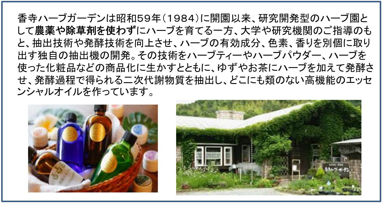 2020年10月香寺ハーブガーデンの福岡社長と出会いました。福岡社長は日本でハーブが知られていない30年前からハーブの効能に着目され、北海道美瑛のラベンダーで有名な富田ファームの社長とともにハーブを日本で普及させる活動をされてきました。