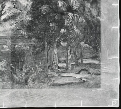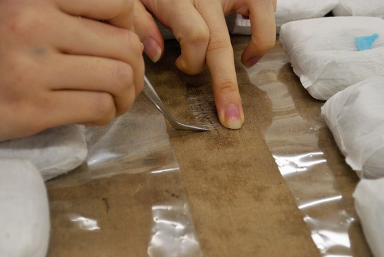 (麻糸を1本ずつ接着してキャンバスの破れを補修している) (株)文化財マネージメントの宮本です。前回に続いて、中右恵理子先生にご執筆いただいた油彩画修復についてのコラムの続きを掲載します。今回は修復作業についてです。 高橋源吉の油彩画は現状では状態がかなり悪いです。画面全体に亀裂が生じ、所々絵具が剥落しかかっています。また、キャンバスが木枠から外れかかって大きな変形が生じています。このような状態の油彩画を修復するためには、絵具の剥落を防ぐ接着作業や変形を修正する作業が行われます。構造的な強化の他に、埃が堆積した画面や裏面のクリーニング、絵具が剥落してしまった箇所に色を補うなどの美的な処置も行われます。写真は大学で行っている他の油彩画の修復作業の様子です。 〇絵具の接着強化剥落しかかっている絵具片を接着剤で固定します。下の写真は接着剤を入れた後に、シリコン製のシートの上から電気ゴテを当てている様子です。油絵具の塗膜は厚みがあり、硬く、変形していることが多いので、絵具を温めながら塗膜をしっかりと固定させます。 (接着剤を入れてシートの上から電気ゴテを当て、絵具を固定している) 〇裏面のクリーニングキャンバスの裏面には、経年による埃などの様々な汚れが積もった状態になっています。虫の巣が発見されたり、カビが付着したりしていることもあります。下の写真は修復作業用の小型クリーナーを使用して埃を除去している様子です。 (小型クリーナーで埃を除去している) 〇キャンバスに生じた破れの補修木枠に張られた状態のキャンバスに物が当たると破れが生じることがあります。昔は破れた箇所全体に裏面から布を接着する補修が多く見られました。そうすると布の形に画面側に変形が出てしまいます。下の写真は麻糸を1本ずつ接着して補強する補修方法で、強度もあり変形も生じにくいです。 (麻糸を1本ずつ接着してキャンバスの破れを補修している) 修復を行うということは、作品に何らかの手が入るということなので、何を重視してどこまで手を加えるかが大事になってきます。描かれた当時の歴史的な情報も重視しながら、今後の保存や絵画としての見やすさなどを慎重に考慮しつつ、作業を行っていきたいと思っています。皆様のご支援、どうぞよろしくお願い致します。