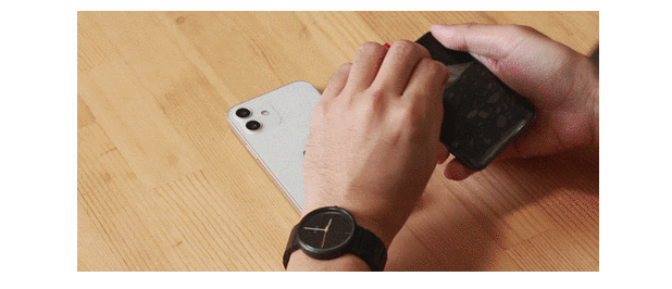 ※【ポケットジョイパット】の接着面にある保護シートを剥がし、スマホの背面のカメラを隠さないよう縁に合わせて貼り付けてください。