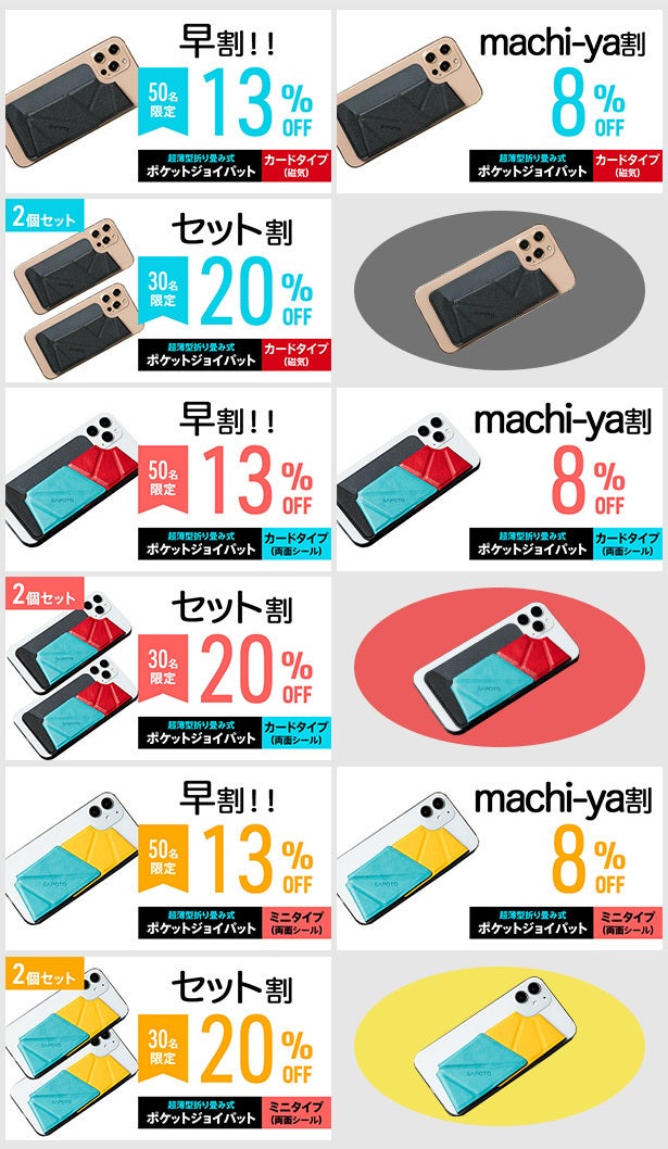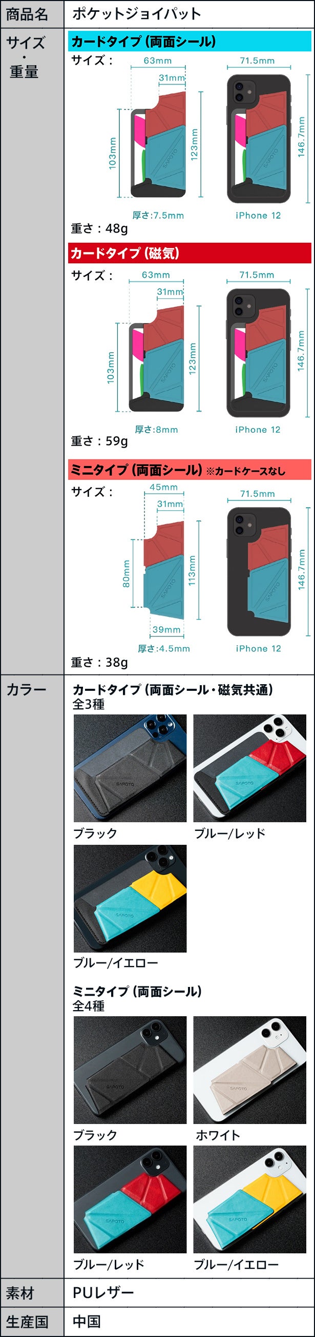 【ポケットジョイパット】はiPhone12に搭載されているMagSafeなど磁器対応スマホに装着できるマグネットタイプと、傷を付けにくい粘着剤を使用した両面テープタイプの2種類をご用意。