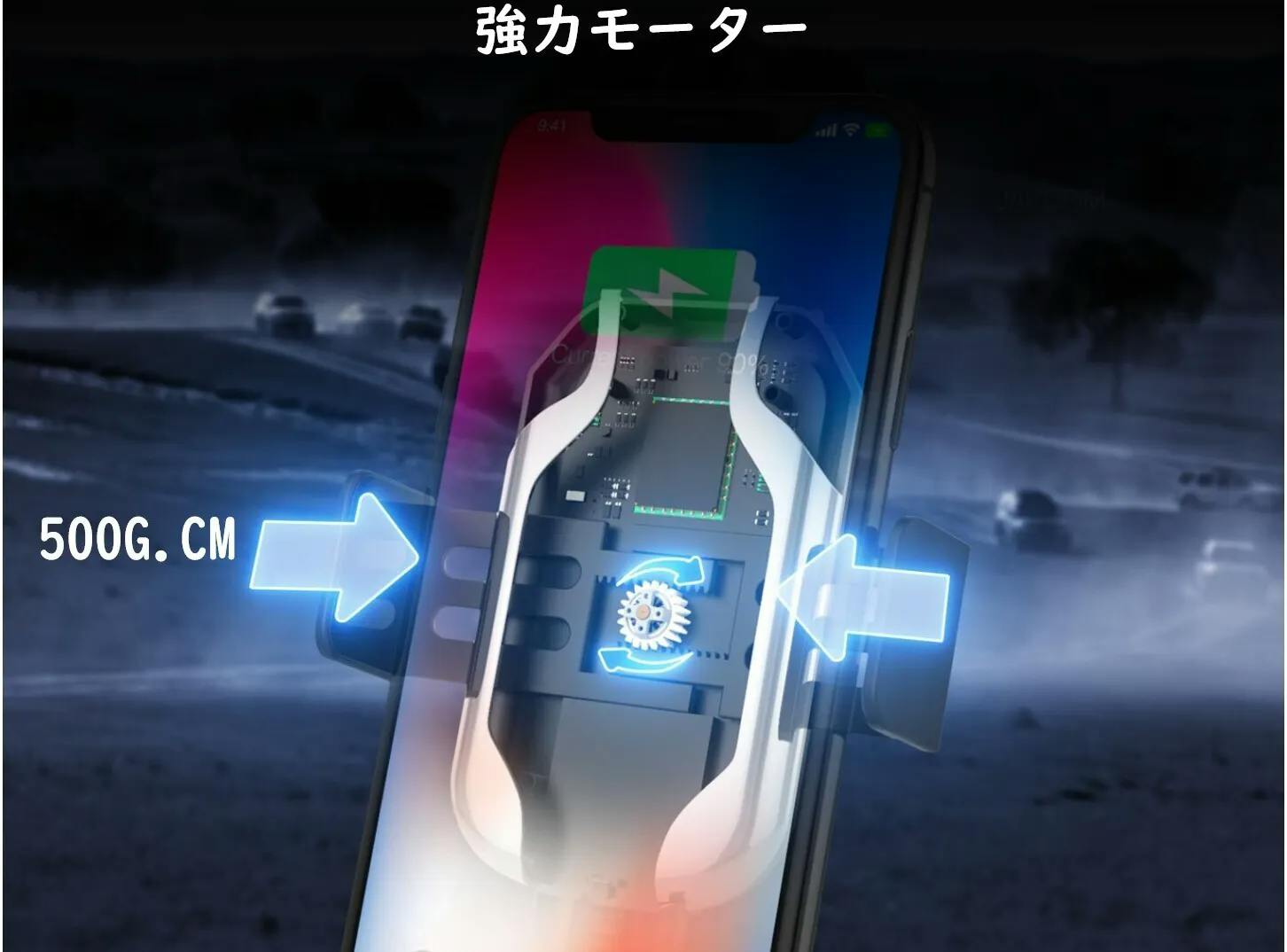 最大出力500gf・cmの強力直流式モーターを採用しているため、スマートフォンをガッチリホールドすることが出来ます。走行中、スマートフォンの落下やぐらつきの心配無用です。
