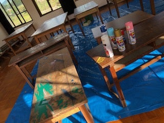 旧山内小学校から机やいすを運び込み、地域の大工さん指導の下、修繕し、思い出の残る形でリユースしました。