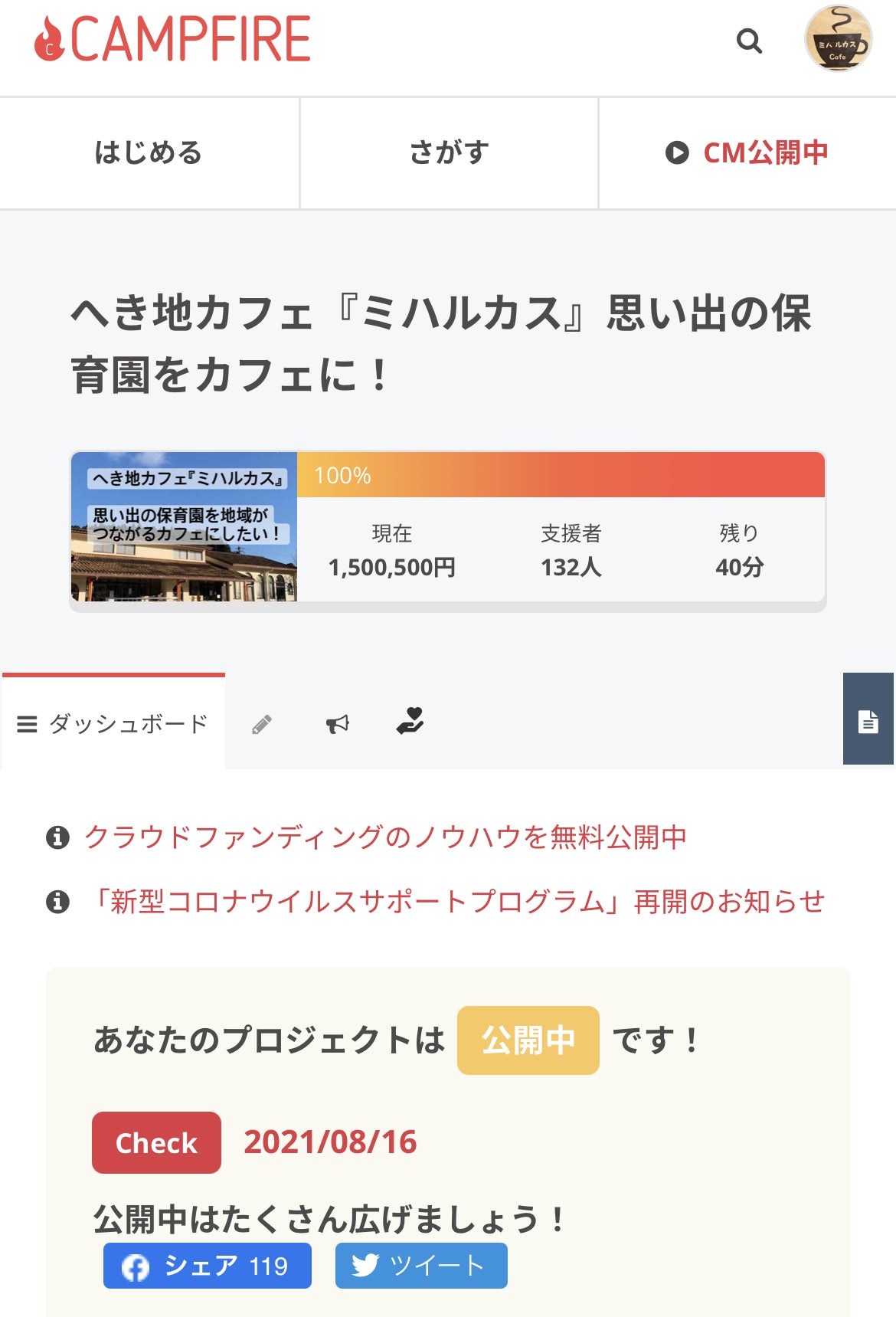 応援してくださるたくさんの方に見守られながら、ミハルカスのクラウドファンディング、終了まで1時間を残すところで目標金額達成させていただきましたm(*_ _)m私たちらしく、みんなに心配されながらの最終日。ドキドキハラハラの楽しい時間、共有していただけましたでしょうか(^^)掲げた大きな目標は、とても手の届くものではないと思っていました。私たち以上に心熱く、応援してくださっている皆さまのお力に助けていただきました。本当にありがとうございます。100%です!3年間の活動、全力で取り組めるご支援をいただきました。96%で終了するものと思っておりましたので、心の準備も、報告も整わず、ひとまずこの瞬間にお知らせを届けさせていただきます。改めて、色々なことご報告させていただきたいと思います。皆さま、どうぞ安心しておやすみくださいませ。
