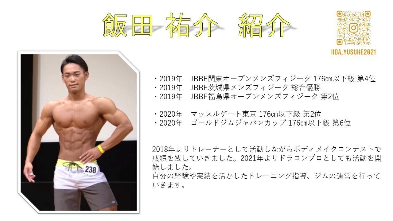 トレーナーとして活動しながら茨城県フィジークで優勝や去年はマッスルゲート東京2位、ゴールドジムジャパンカップ6位など優勝入賞を多数経験しました。