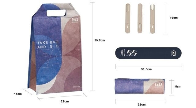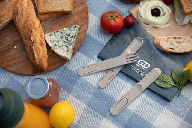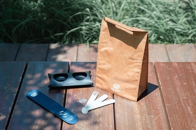 BAGOROLLには、環境にやさしいカトラリーと折り畳みカップホルダー、サラダトング、ドリンクスリーブが付属しています。