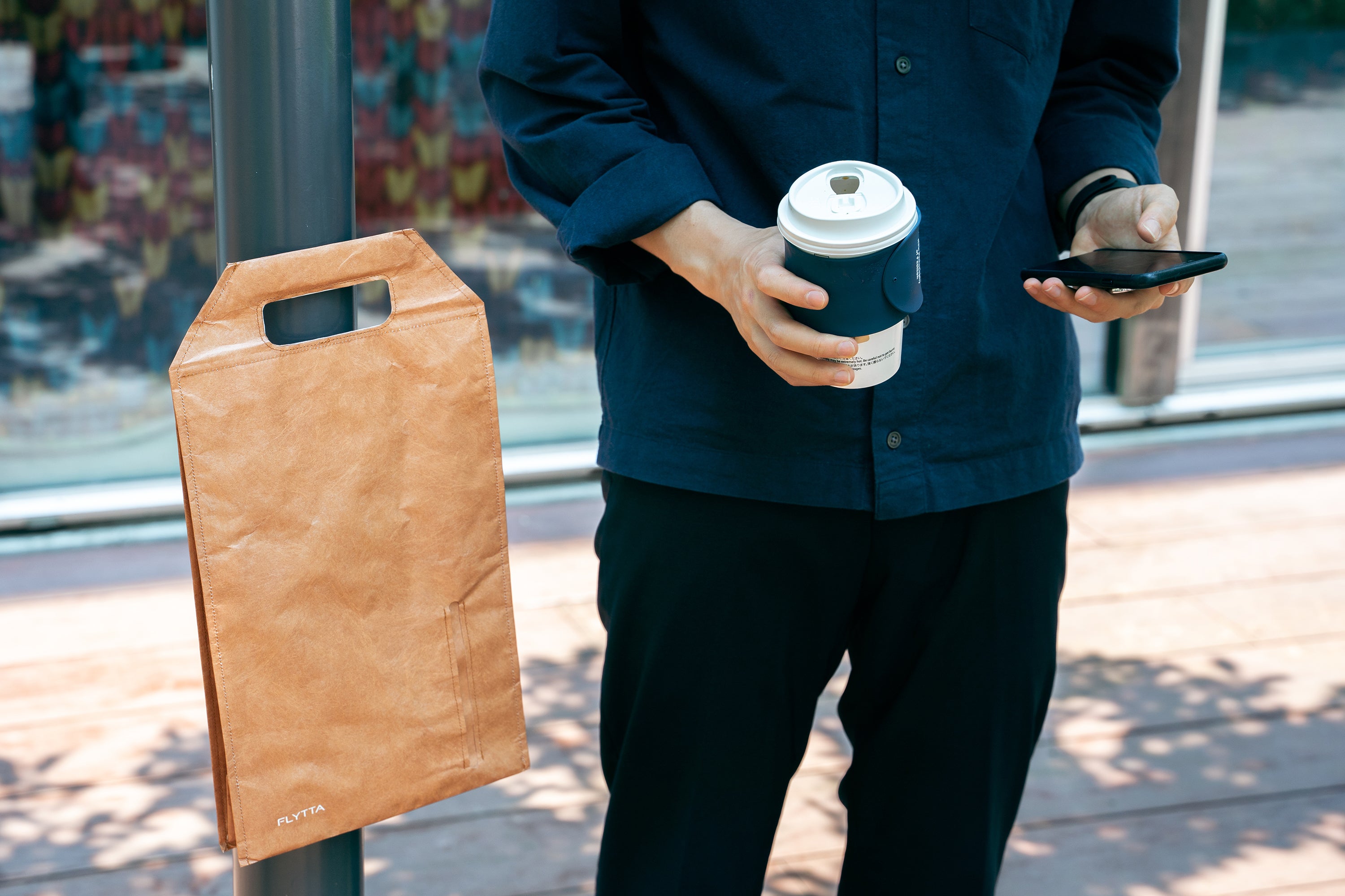 専用折りたたみカップホルダーは、折りたたんで持ち運びができ、再利用が可能でお手入れも簡単。BAGOROLLにぴったりと収まるので、バッグの中でもドリンクが安定して持ち運びが楽になります。
