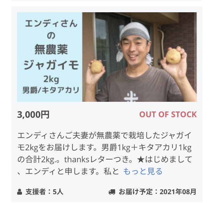 私と妻が、無農薬で栽培したジャガイモ2kgをご支援いただいた方々へ数量限定リターンとしてお届けします。