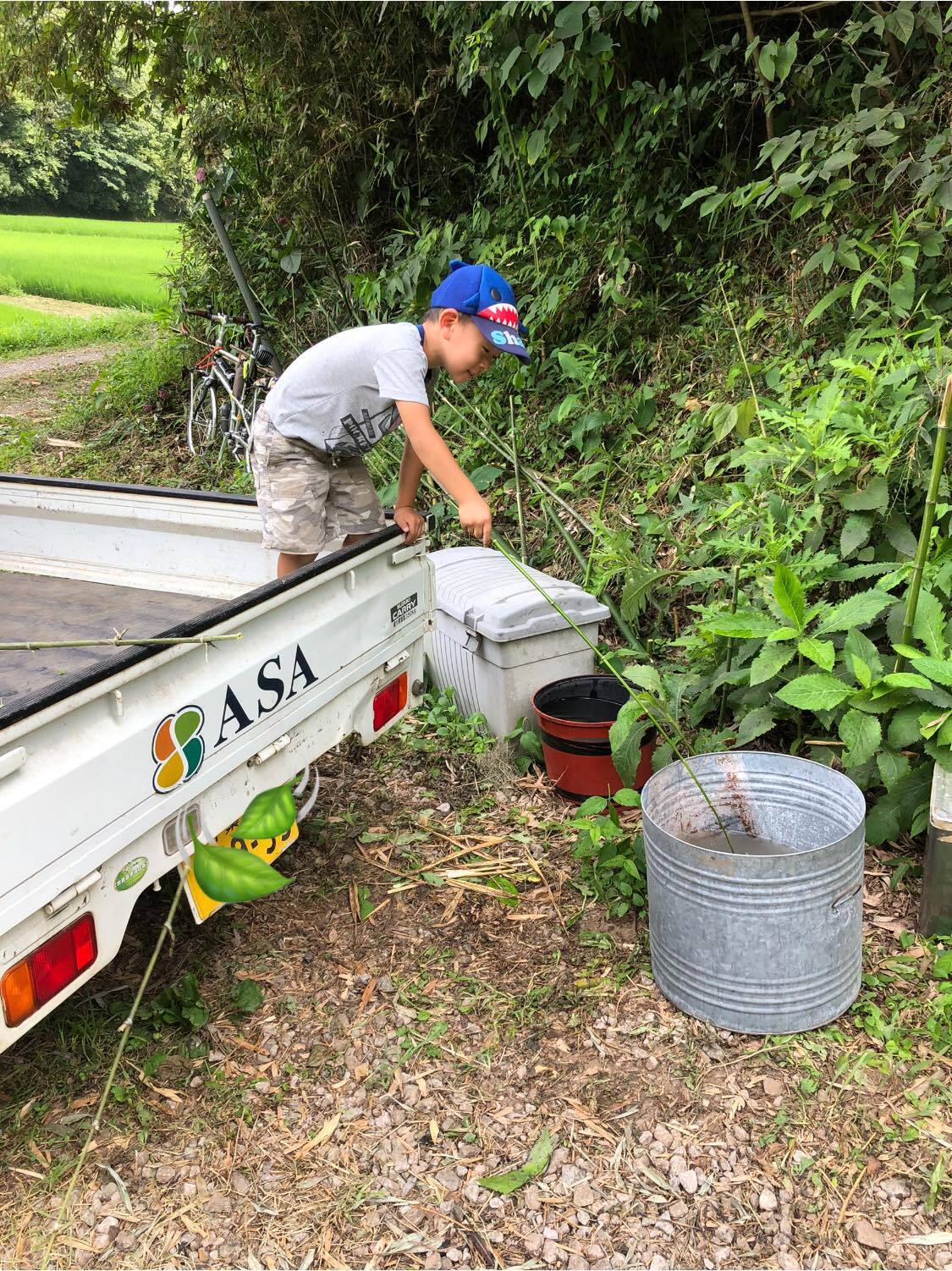 子どもたちは自分でいろんな遊びを見つけますね。バケツの中の葉っぱを魚に見立ててさかなつり。