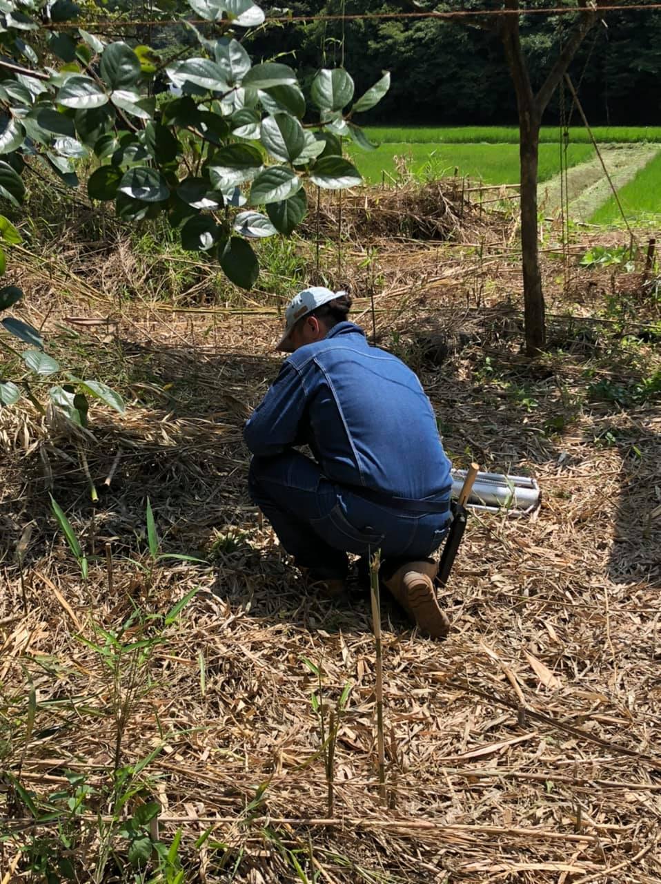 低く切った竹をつまづかないようにノコで切ってます。