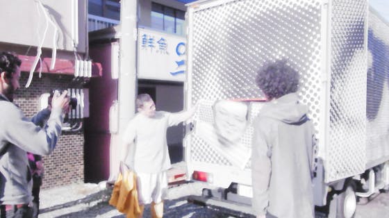 トラックの後ろの赤い口から徐々にプリンターが出てきます。変顔、きめポーズ、真面目、すまし顔など挑戦ください。