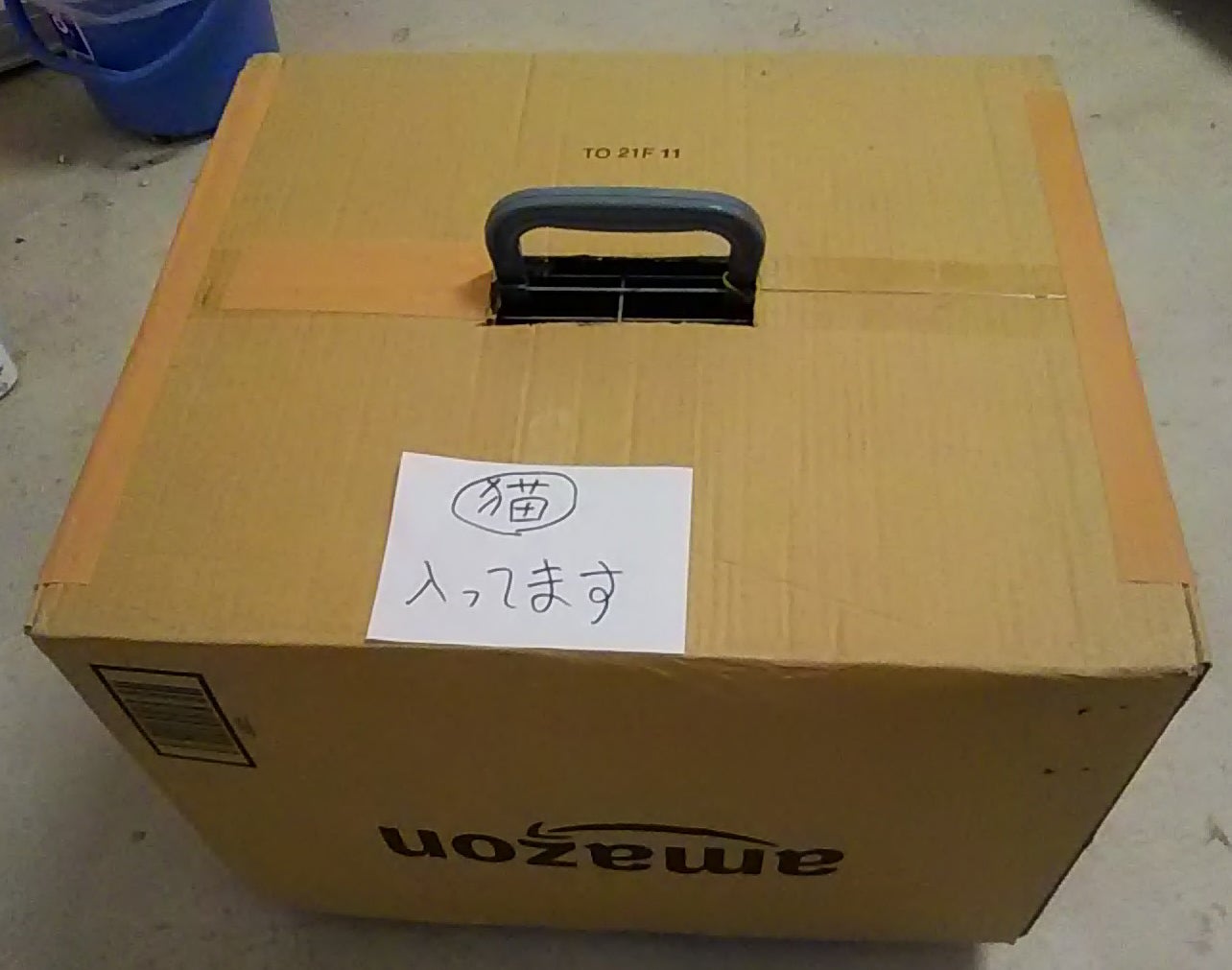 画像は依頼人Oさんから預かった猫(が入ってるケージ+箱)。