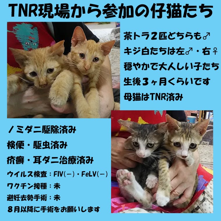 画像の4匹はTNR依頼人から現場仔猫の預かりと里親探しの依頼がきたので預かりボラさんに託した子たちです。