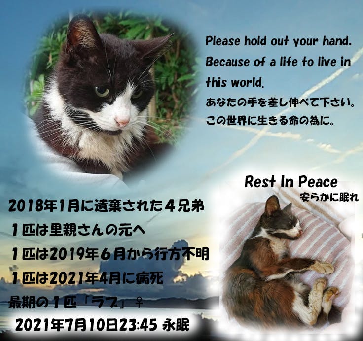 ラブと呼ばれていた最後の1匹が、約3年半後の2021年7月10日に病気のためその命を終えました。