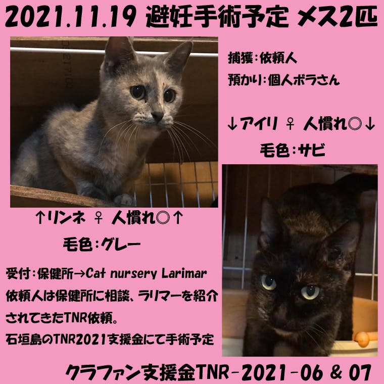 支援金TNR以外にも、依頼人が手術代を負担してふくぎの会や島猫見守るニャンの会が術前術後の預かりをする形でお手伝いしたTNRが3匹、石垣市の地域猫指定区に居着いた新入り猫のTNRが1匹あり、今月のTNR合計は9匹となっております。
