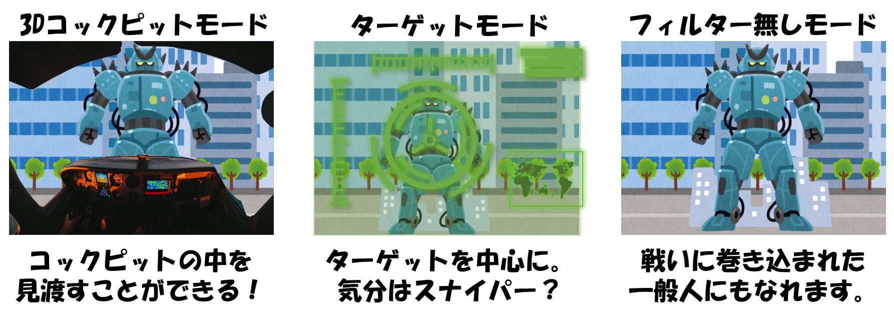 お気に入りのロボットと一緒に戦ったり、格納庫に並んでいるのを眺めたり、大怪獣から逃げまどってみたり。ブンカメがあればそんな夢のような世界に没入することができます。
