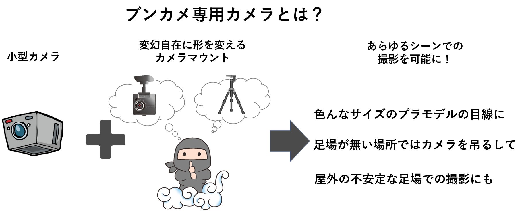 専用カメラは小型カメラと自由度の高いマウントを組み合わせることで、色んなブンドドのシーンに配置しやすいものにする予定です。