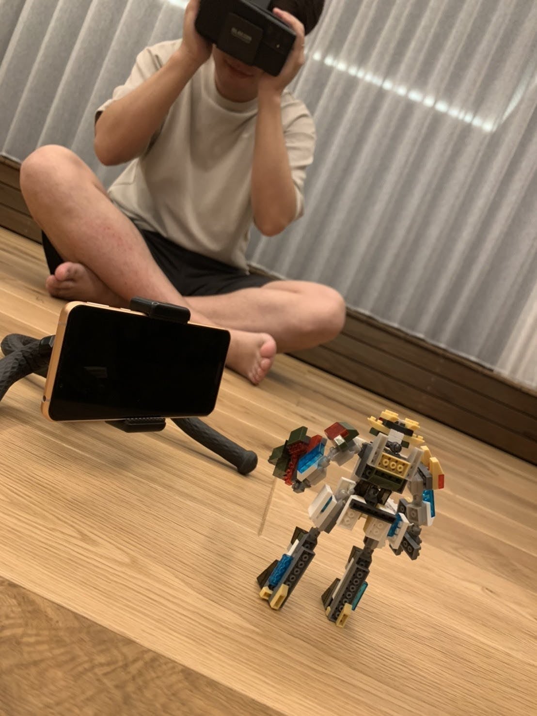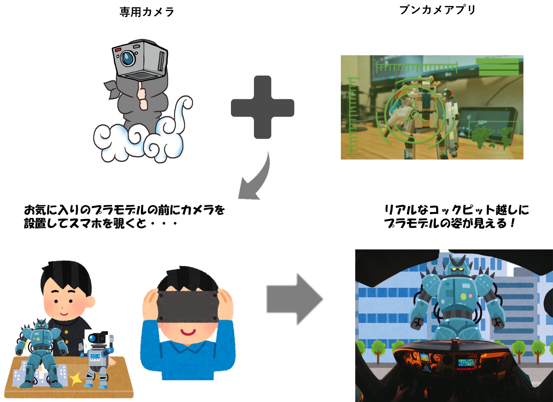 最終的には専用のカメラデバイスを作成し、それをプラモデルやフィギュアの前に配置して接続されたスマートフォンの画面からのぞき込むことを考えています。