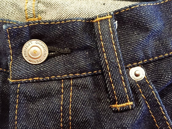 まずオンス(生地の重さ)ですが、14.5オンス程になります。縦糸、横糸共にしっかりした番手の糸を使用しており、もちろんCOTTON 100%になります。