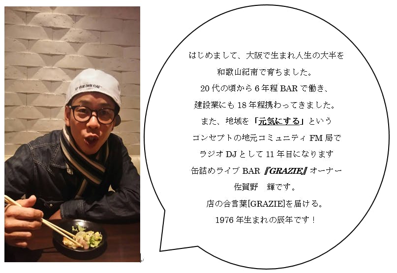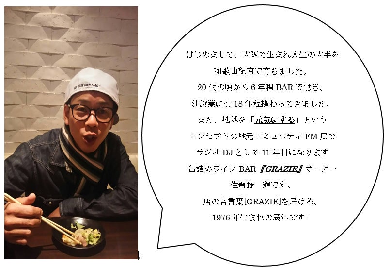 昭和51年大阪市で生まれ。12歳から和歌山県へ移住し様々な職務を経験しながら現在、地元でラジオDJ、イベンターとして活動しております。昨年、地域を音楽イベントで盛り上げ、地域活性化を目的としたチャリティー音楽イベント「チェーンロックFes」というものを企画しました。多くの人達のお力を借り、支えられ、そのおかげで無事に大成功という結果で次回につなげていくことが出来ました。