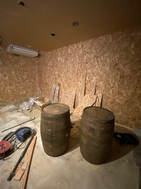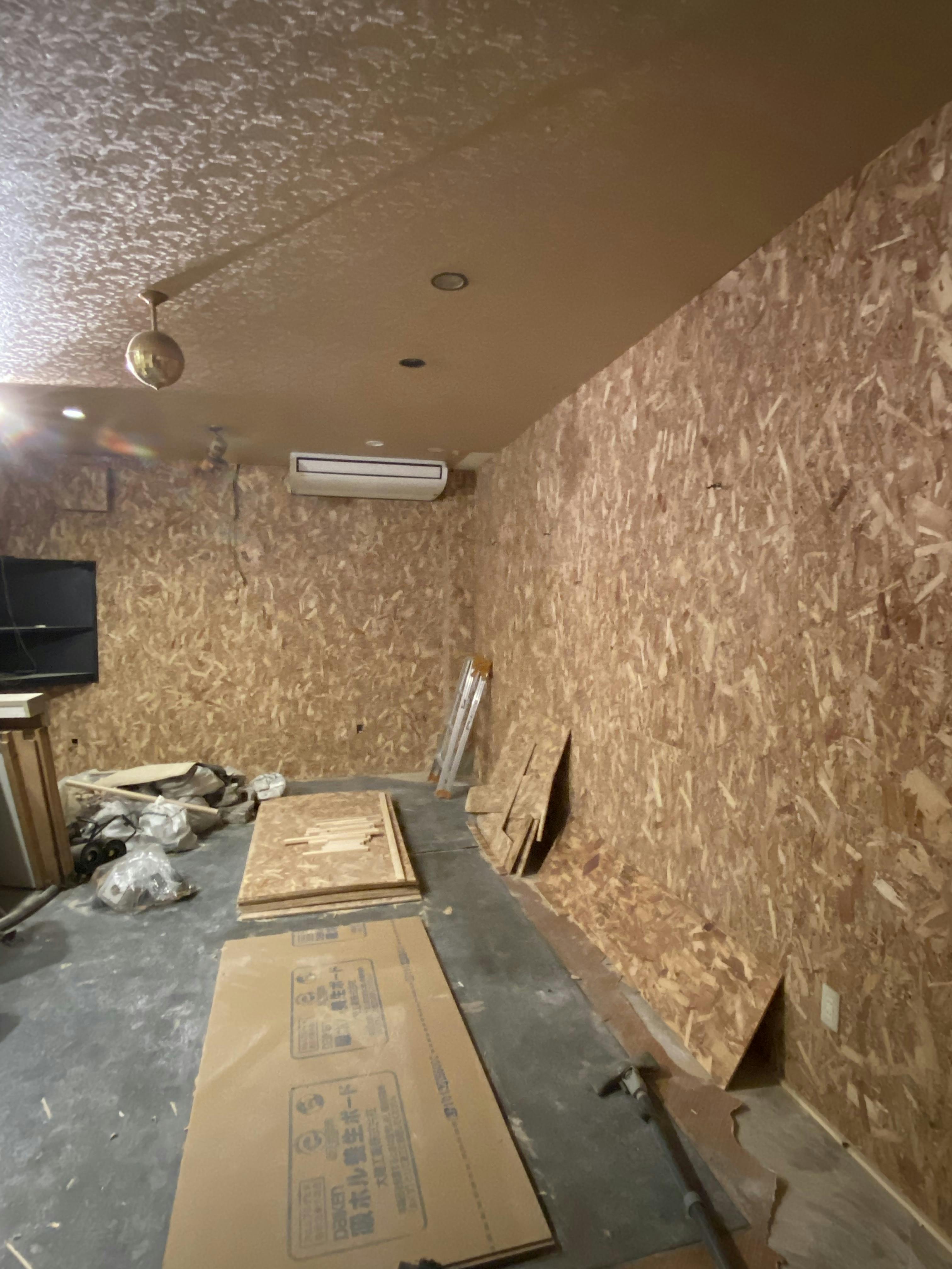人数は20名キャパを考えています。カウンター席は5席程度。テーブル(ドラム缶や樽型テーブル)を数台と壁際にテーブルを取り付け、木目調の壁でシンプルでオシャレな店内にします。(予想以上の壁面積で材料費が思った以上にかかりそうですが・・・・汗)