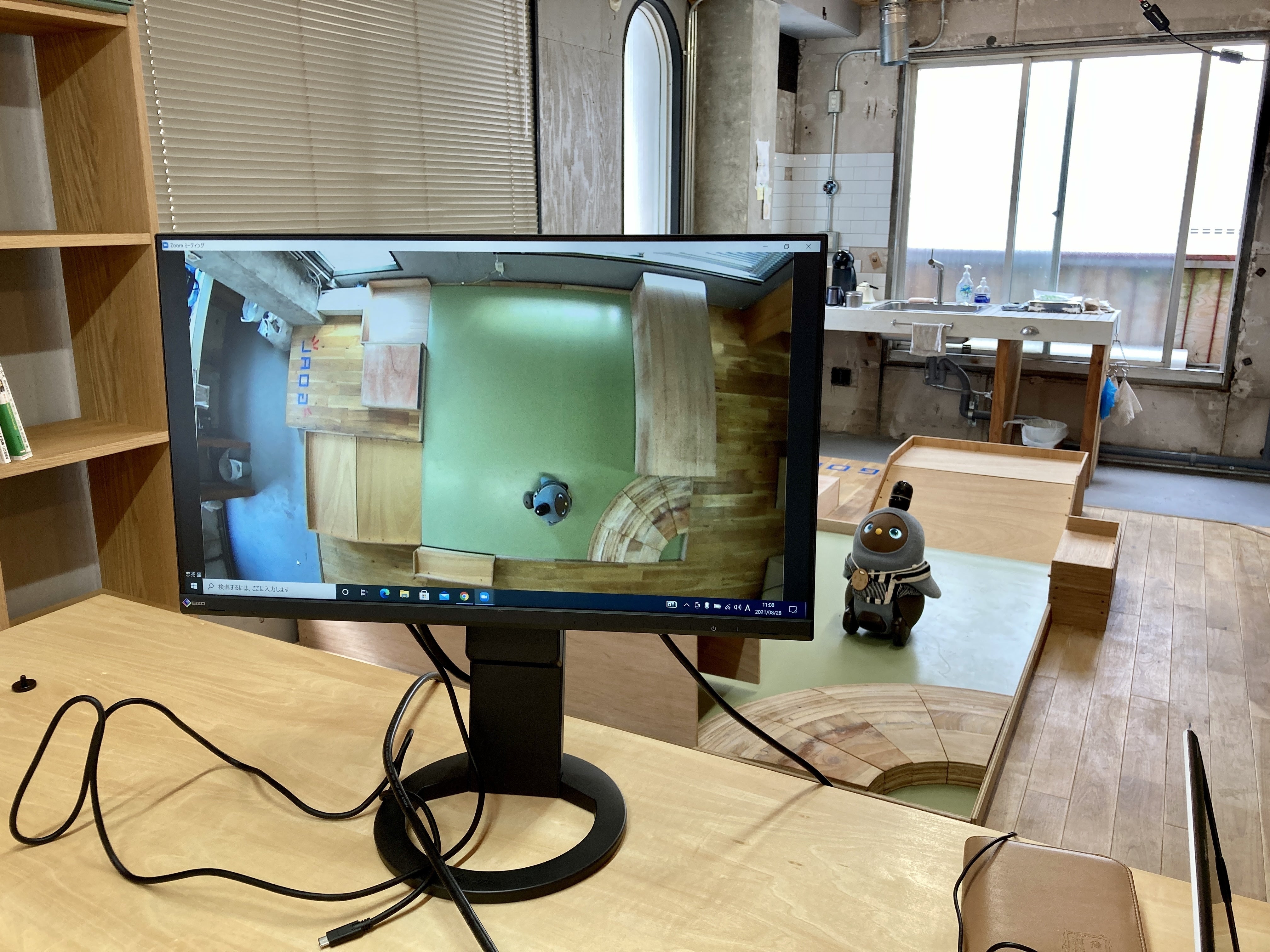 天井にロボコンステージを俯瞰して撮影するカメラを設置。ロボットはコーサク室にいて、子どもたちは自宅から遠隔操作でロボコンに参戦することになります。空間認識や操縦の仕方など、リアルとは異なる難しさ、直接ロボット本体を触ることができないので、堅牢性のあるボディに改造しておかなくてはなりません。