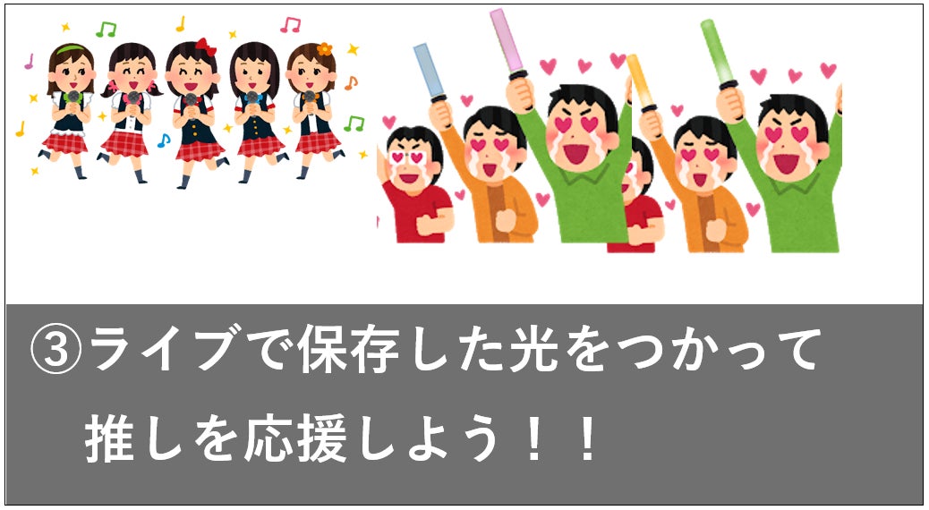 彼女たちからもらった元気を今度は彼女たちを応援するために使いたい、いつももらっている勇気や応援をライブで少しでも届けたいと思いペンライトを選びました。