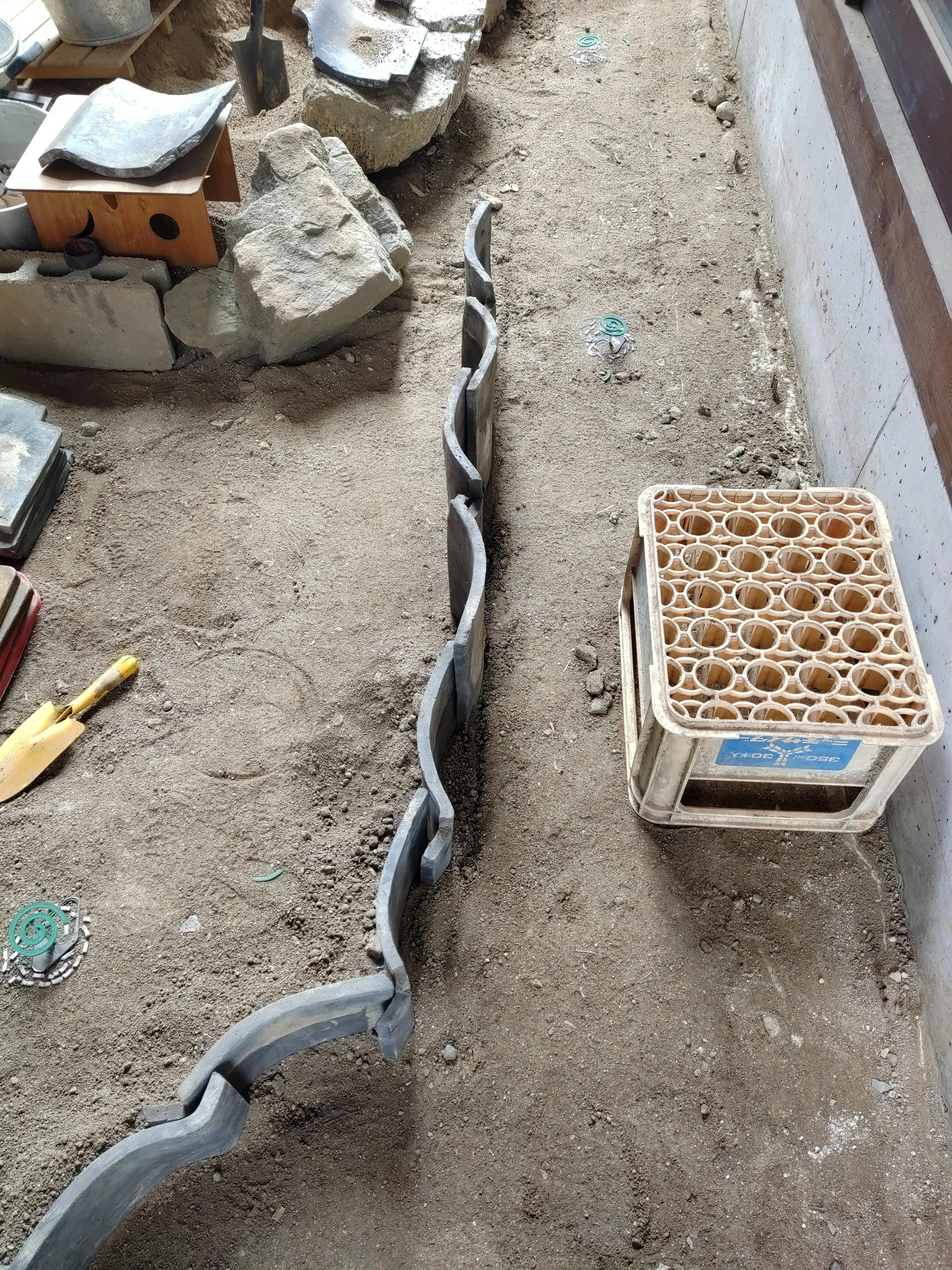 犬走の境に瓦を並べたり、土を移動したり、石垣積みの段取りを行いました。