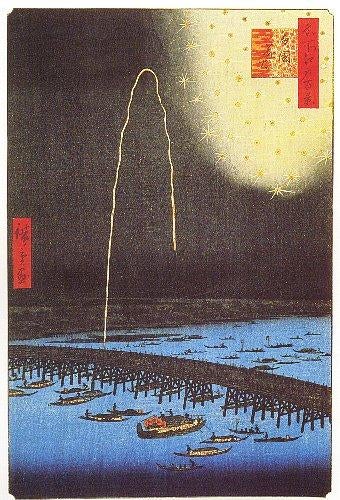 享保17年(1732年)、大飢饉の影響か、江戸でコレラが流行し大勢の死者が出た事から、慰霊、悪疫退散のために両国川下で水神祭が催され、同時に隅田川両岸の水茶屋でも5月28日に川施餓鬼を催し、死者の追善供養が行われました。この事にちなみ、翌年の享保18年には5月28日に両国川開きが行われ、8月28日までの3ヶ月間(現在の7月から10月 )、納涼舟の舟遊びと共に、毎夜さまざまな花火が六代目鍵屋弥兵衛によって打ち上げられるようになりました。